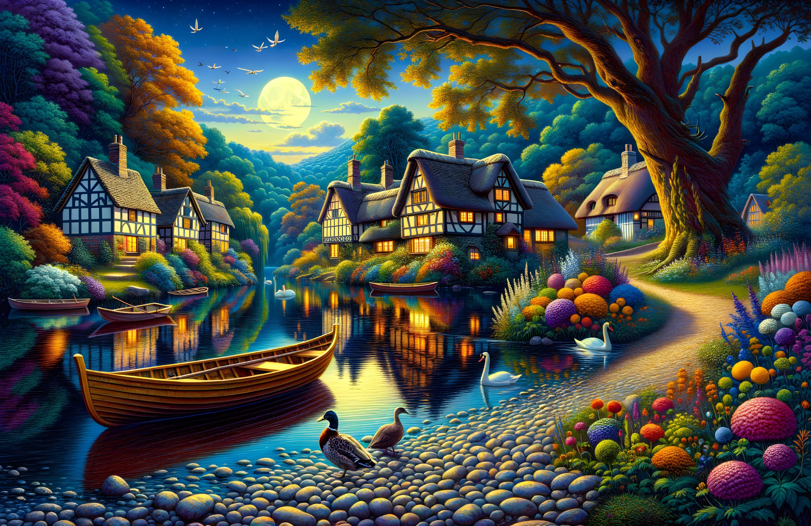 A vibrant, whimsical landscape with thatched-roof houses by a river, a wooden boat in the foreground, swans, and a moonlit sky.