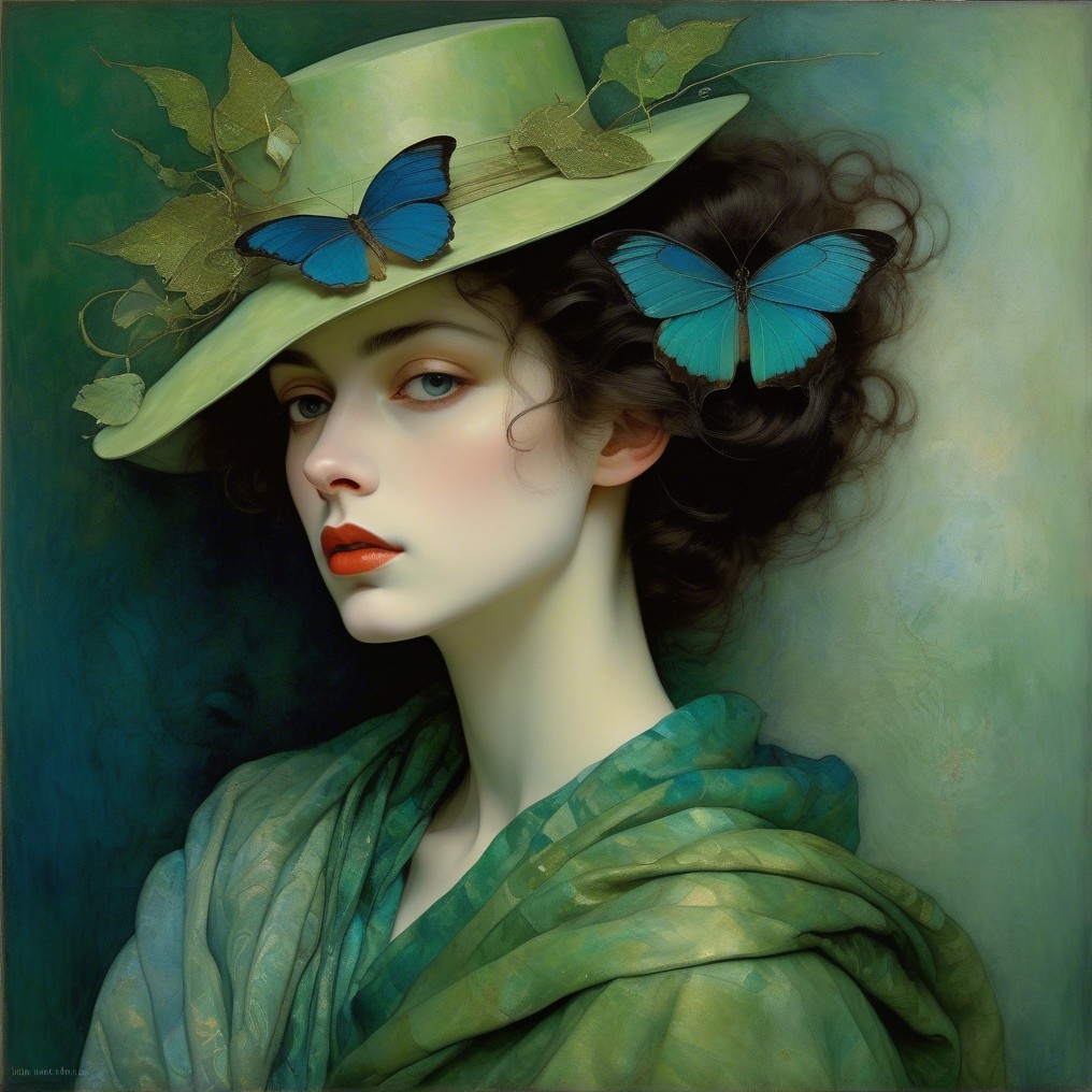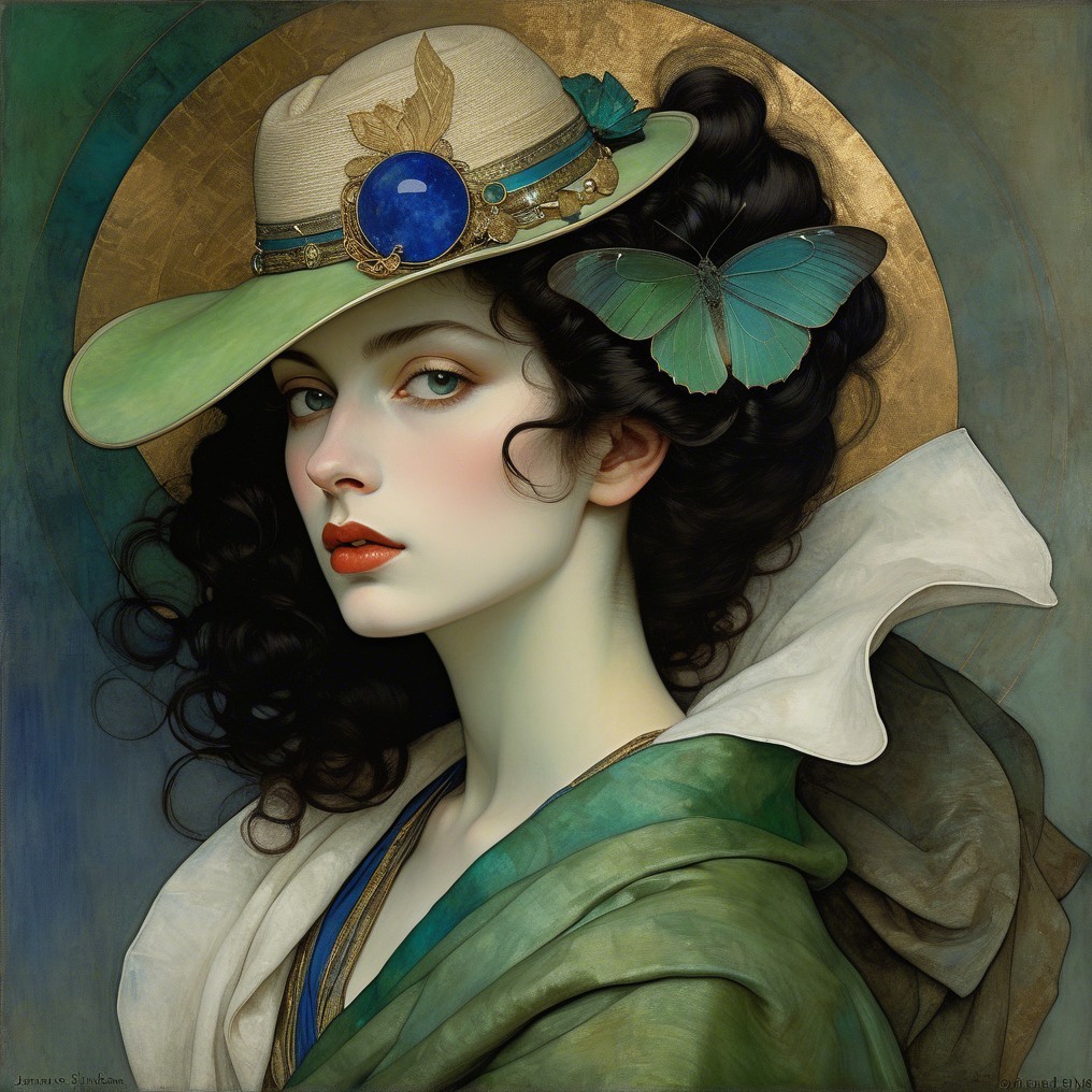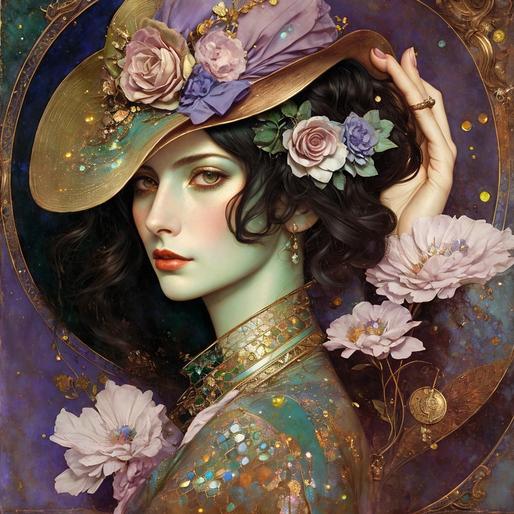 A stunning woman in a vintage hat adorned with blue flowers, dressed in an ornate, dark blue outfit. The ethereal background features a moon and subtle sparkles, enhancing her elegance.