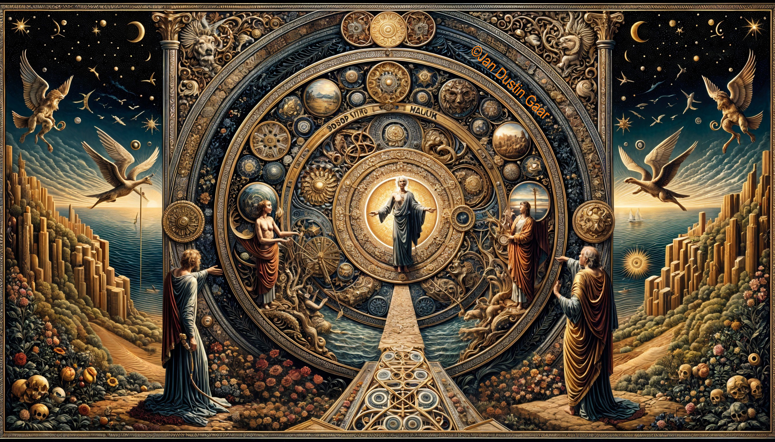 An intricate cosmic tapestry featuring astrological symbols, celestial bodies, human figures, and geometric patterns in a harmonious, detailed artwork.