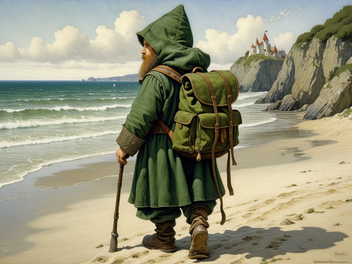 A bearded figure in a green robe stands by the shore, gazing at a distant castle on a cliff. He carries a large backpack, with gentle waves lapping at his feet under a dreamy sky.