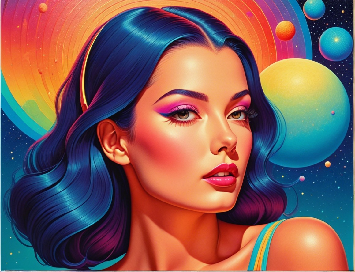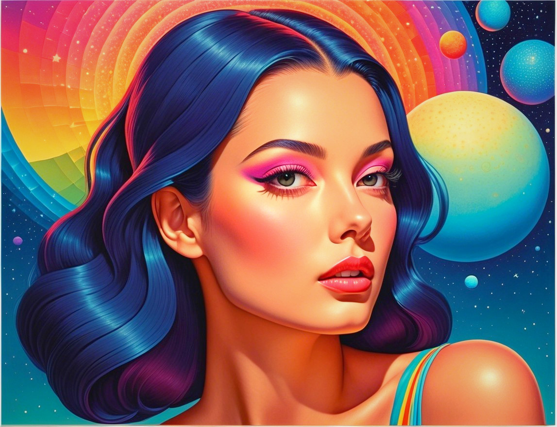 A vibrant portrait of a woman with striking blue hair and bold makeup, set against a cosmic background of colorful planets and swirling patterns, exuding a retro-futuristic vibe.