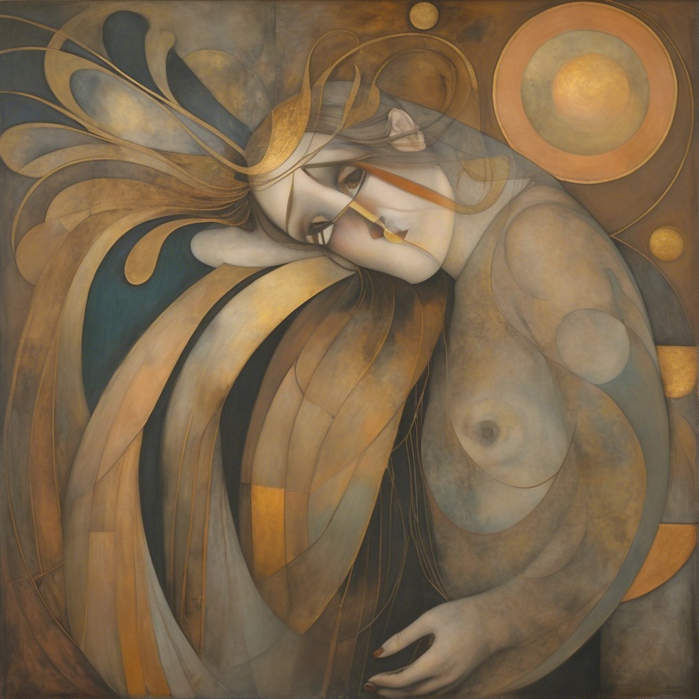 + Prompt:Emerging chrysalis. foggy nostalgia, portrait in Burnt umber and salmon gold, smoke and mirrors, patina of, battery acid, art brut, moody, somber, desaturated colors, in the style of Paul Klee, Arthur Rackham Dark and moody oil painting of a woman with piercing black eyes, inspired by the works of John Singer Sargent and Edgar Degas, long shot, realistic texture, dramatic lighting, intricate details on clothing and Magical woman fading tones of melancholy and summer nostalgia, soulful portrait, in burnt umber, plutonium, patina of mercury glass, tea stains, art brut, moody, somber, desaturated colors, in the style of Paul Klee, Banksy, Arthur Rackham, based on Prompt by KRW