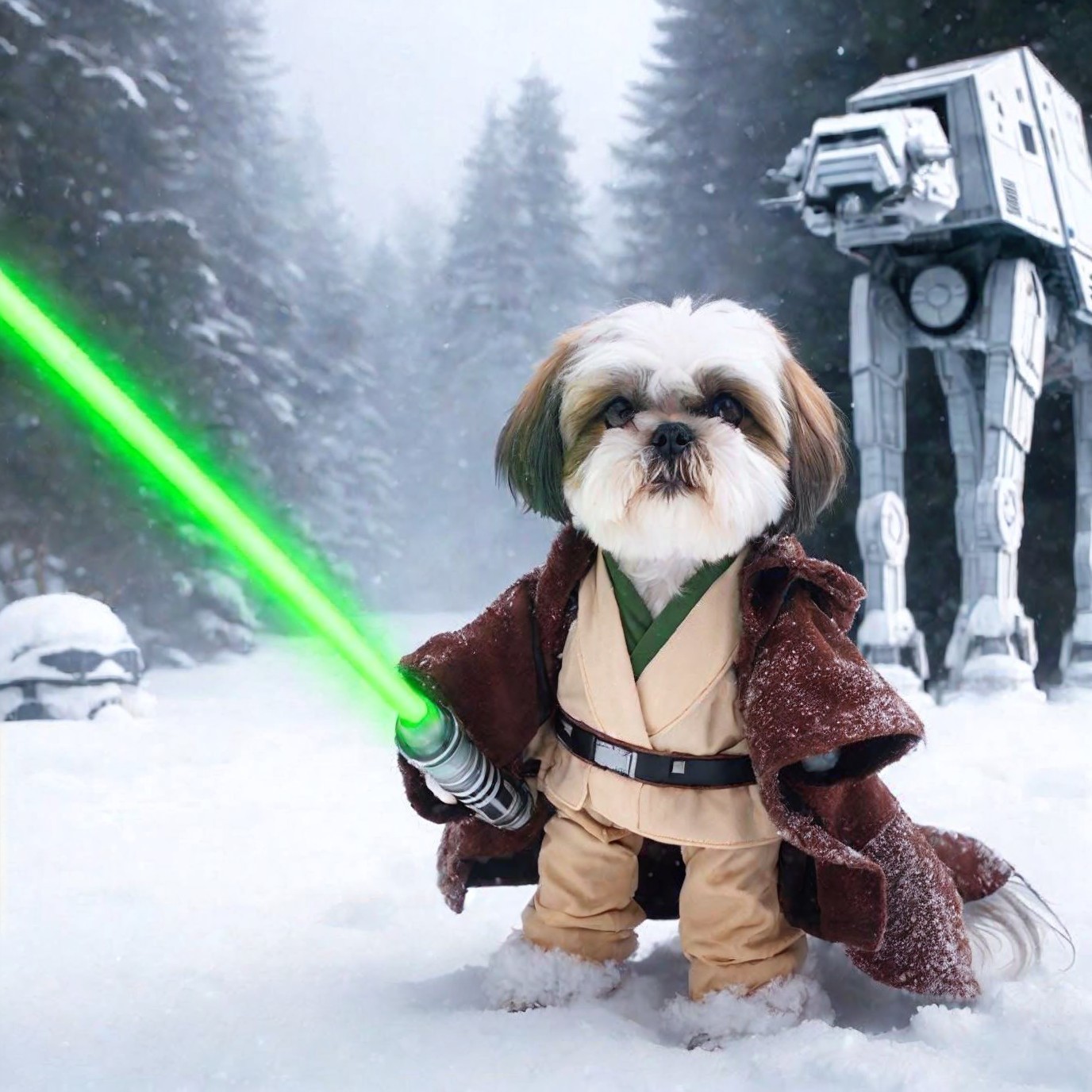 A cute Shih-Tzu dressed up like a Jedi with a green lightsaber in front of a giant AT-AT during a winter snow storm on the Planet Hoth from The Empire Strikes Back.