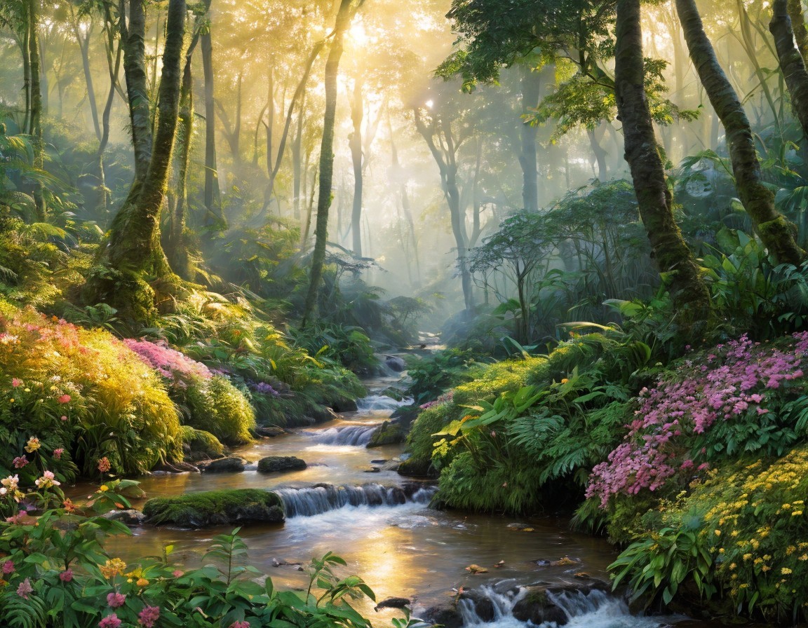 A serene forest scene bathed in golden sunlight, with lush greenery and vibrant flowers lining a tranquil stream. Sunbeams filter through the trees, creating a peaceful, enchanting atmosphere.