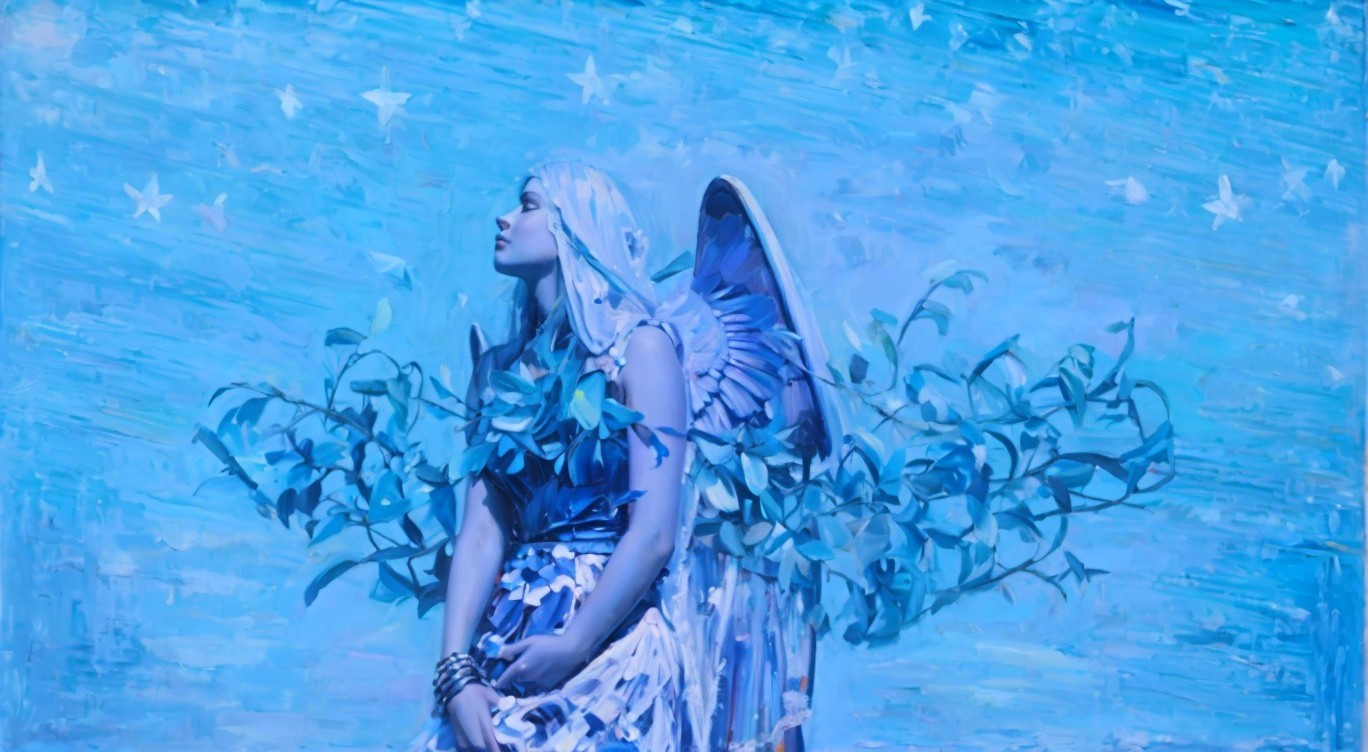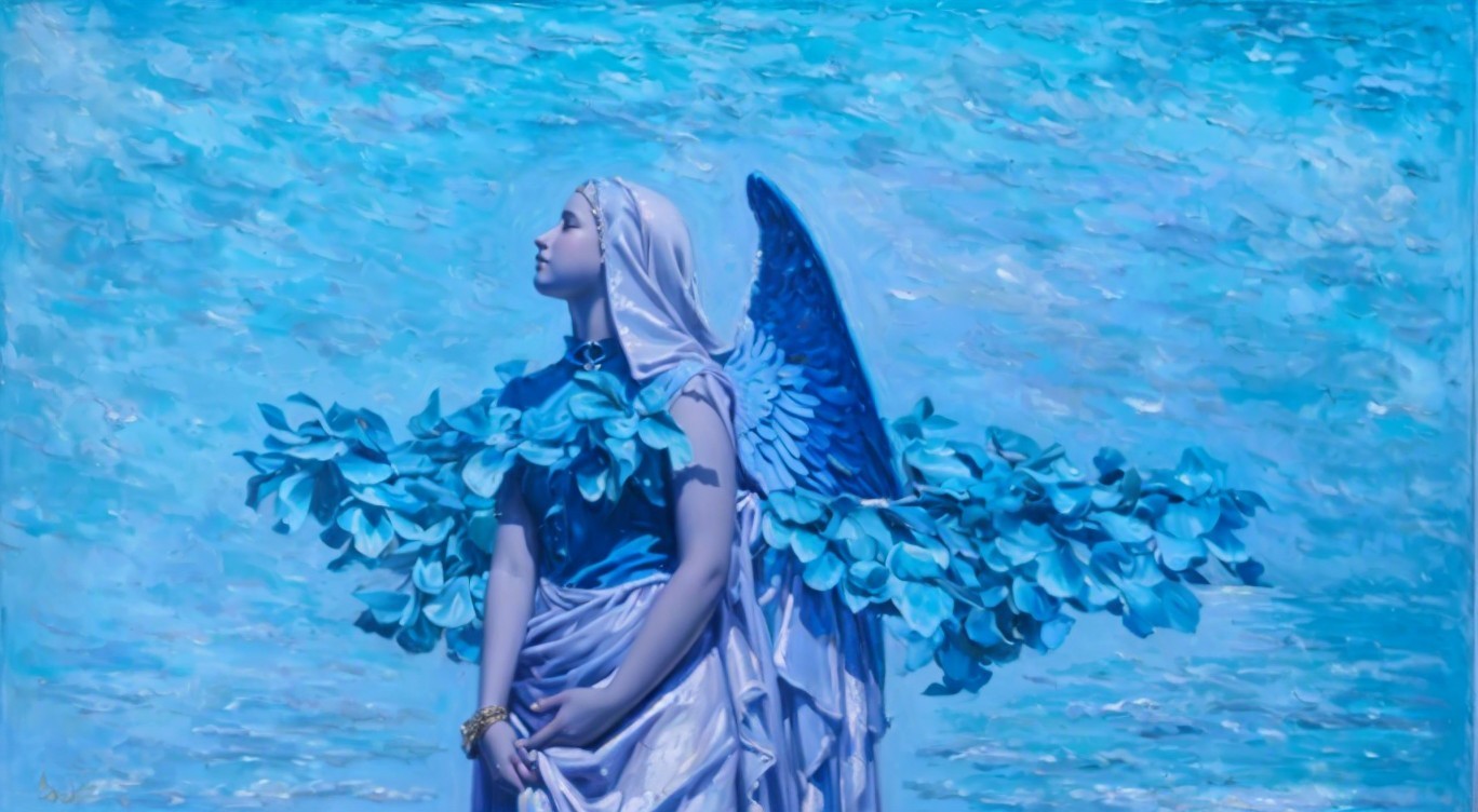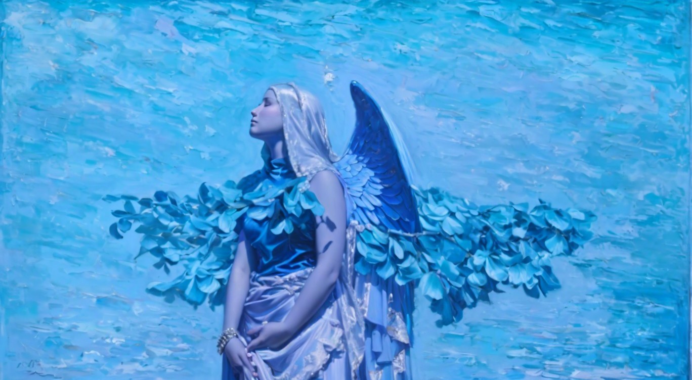Serene Female Figure with Angel Wings Against Blue Sky