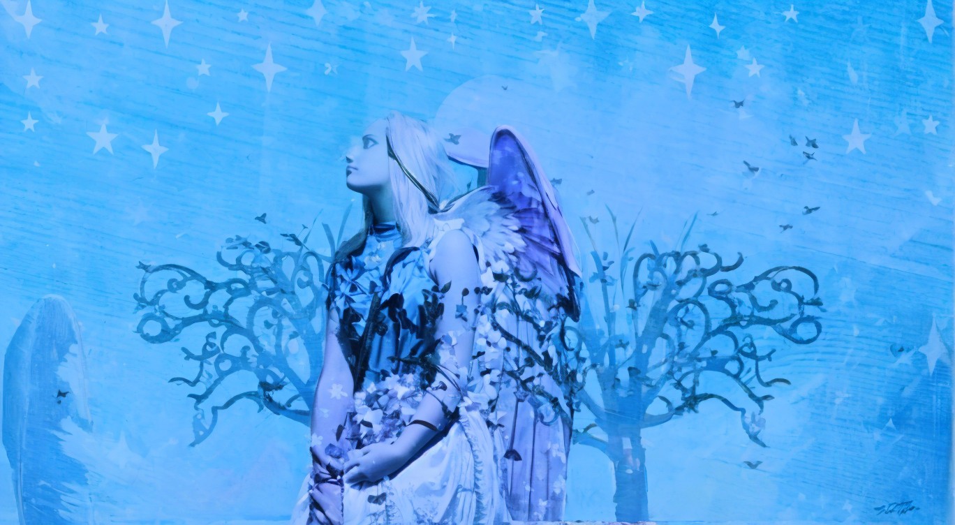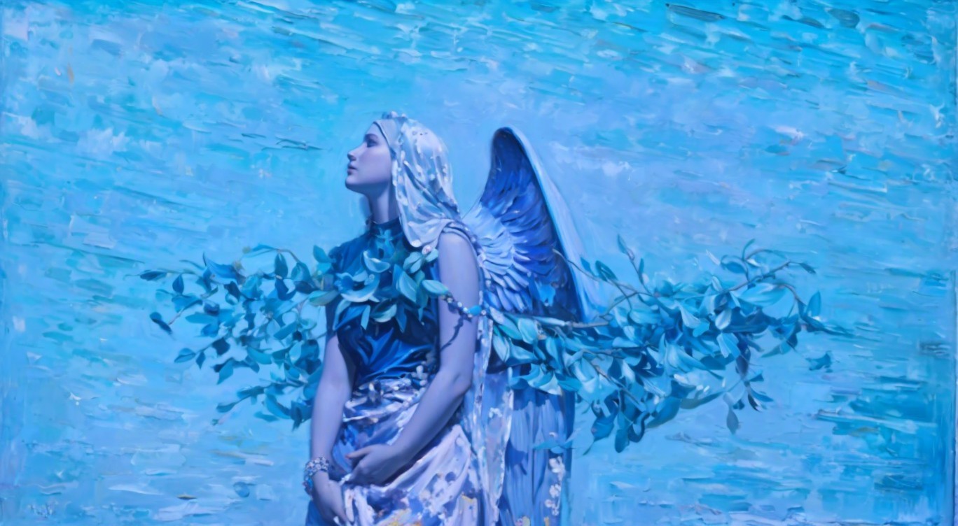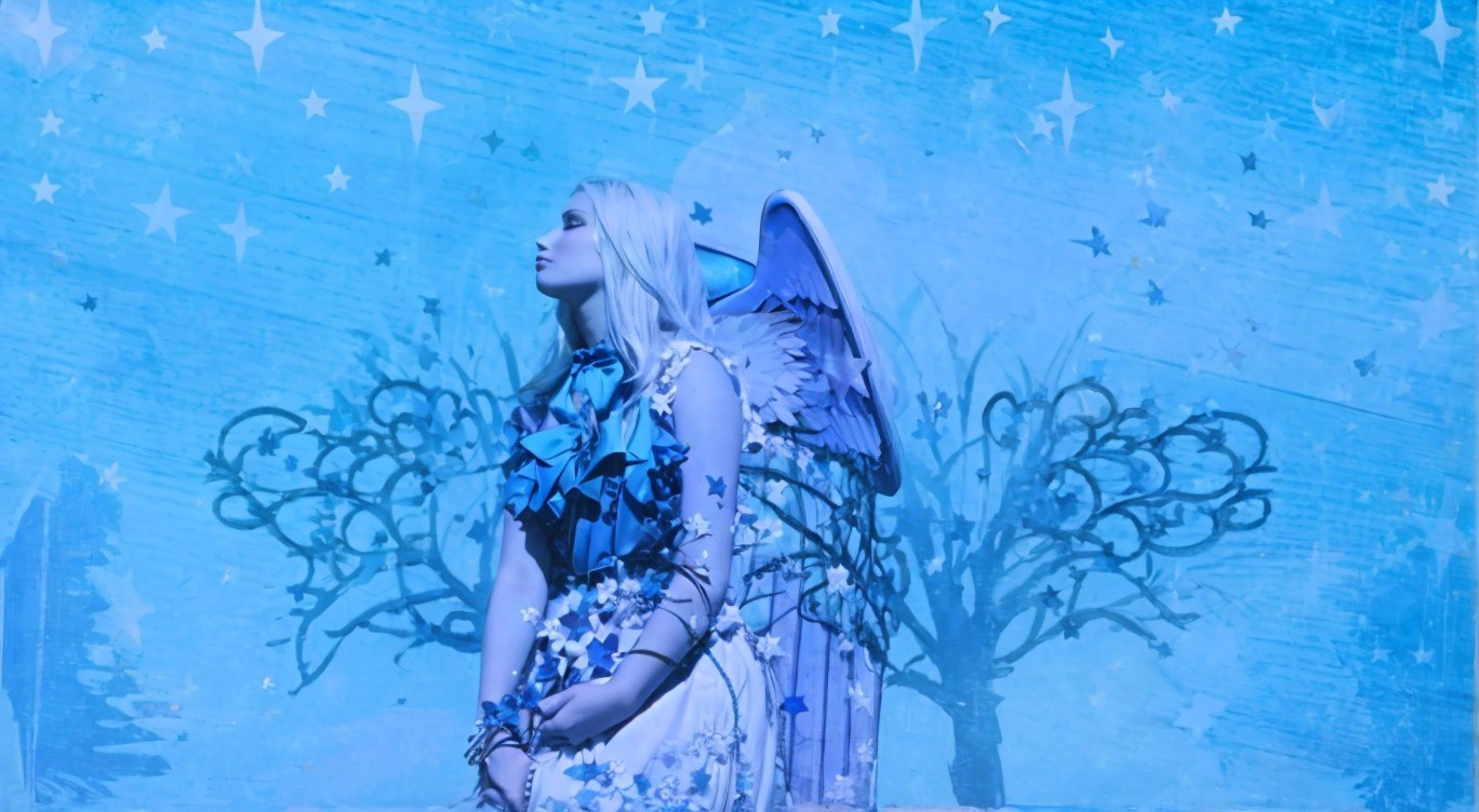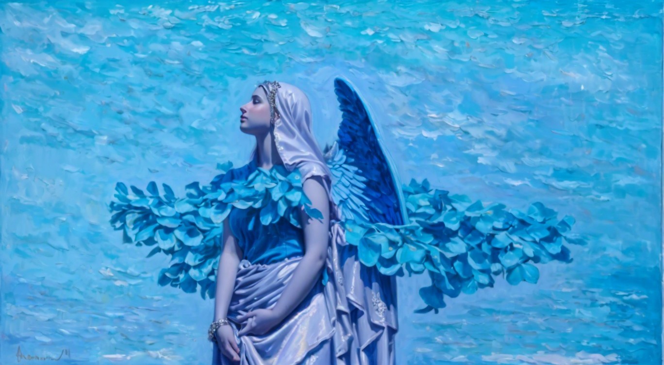 Serene Female Figure with Angel Wings Against Blue Sky