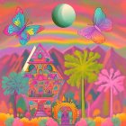 A whimsical landscape features a vibrant, multicolored house surrounded by stylized trees. The vivid pink and purple sky is complemented by a large, glowing moon, creating a dreamlike atmosphere.