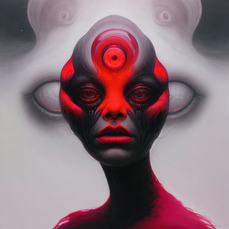 Prompt: "front view portrait of a creepy woman with her face being melted, by Beeple and Zdzisław Beksiński, creepy, black, gray, white and red colors"