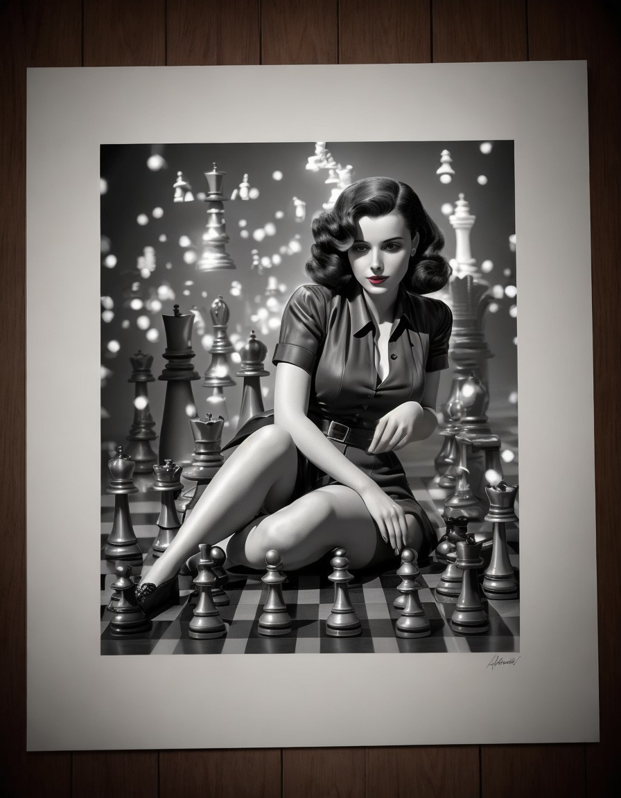 A striking black-and-white image features a glamorous woman in a classic dress, seated among chess pieces on a board. The backdrop shimmers with bokeh, enhancing the elegant atmosphere.