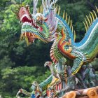 A vividly colored dragon sculpture with intricate scales, vibrant wings, and a fierce expression is perched near a lush, green forest, with water dripping from its mouth.