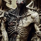 The image features two eerie skeletal figures with intricate, organic designs. Their exposed musculature and elongated limbs create a haunting atmosphere, enhanced by glowing red eyes.