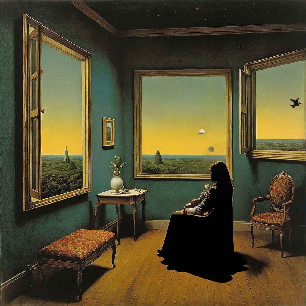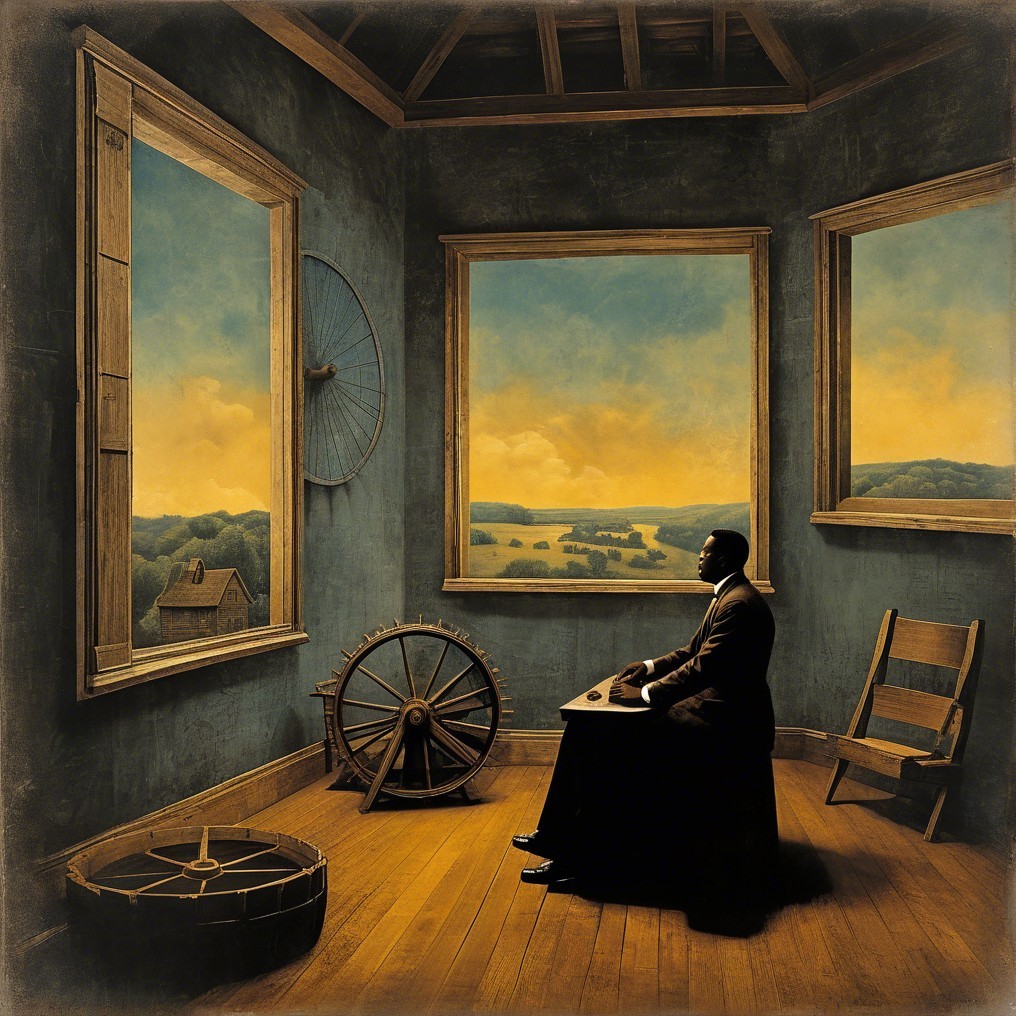 A man in a wheelchair sits thoughtfully in a rustic room, gazing out of large windows at a serene landscape and a plane taking off, surrounded by historical calculations, artifacts, and wooden elements.