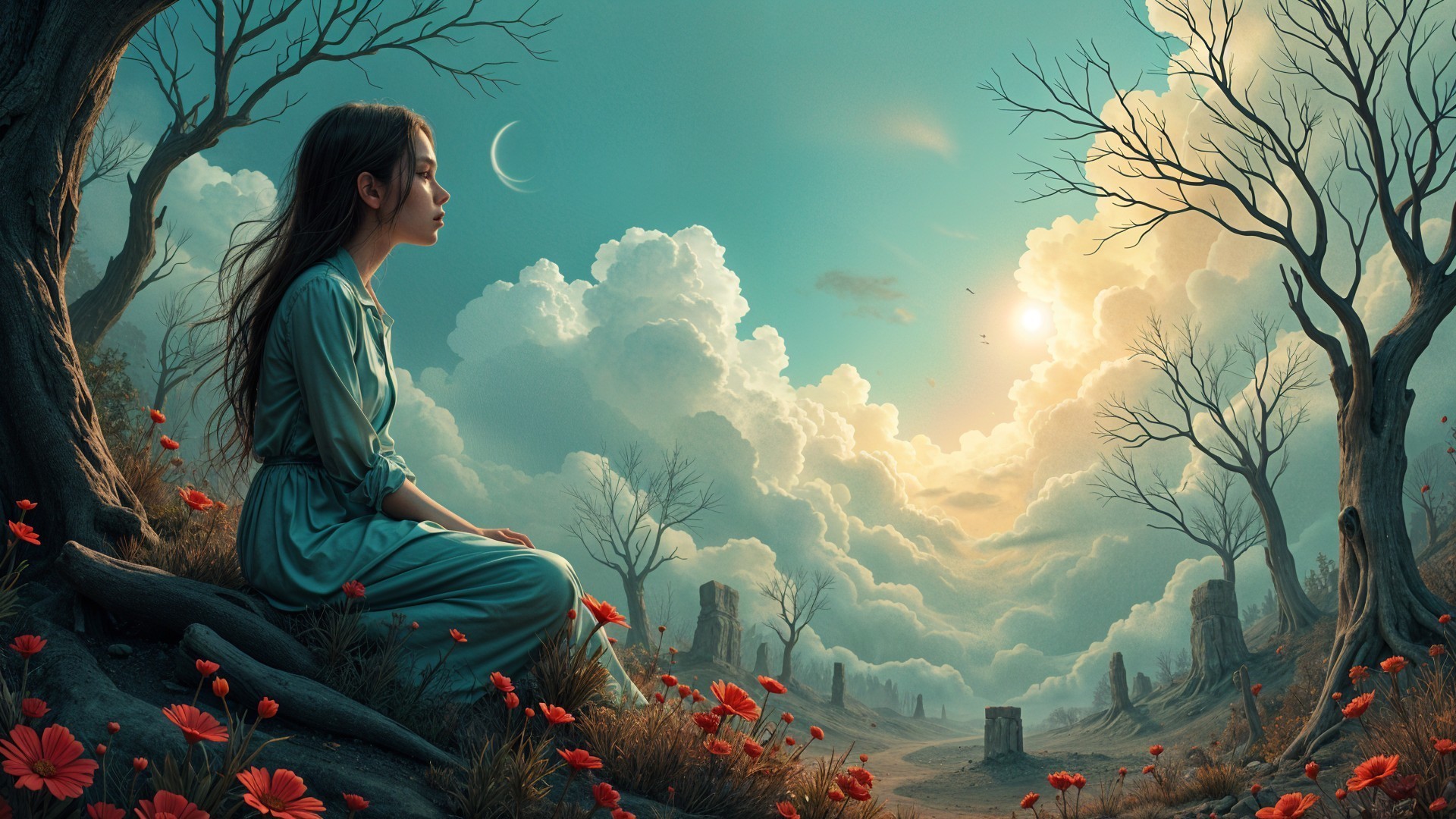 A serene figure in a flowing blue dress sits among vibrant red flowers, gazing at a dreamlike landscape of clouds and an ethereal sky, framed by skeletal trees and distant ruins.