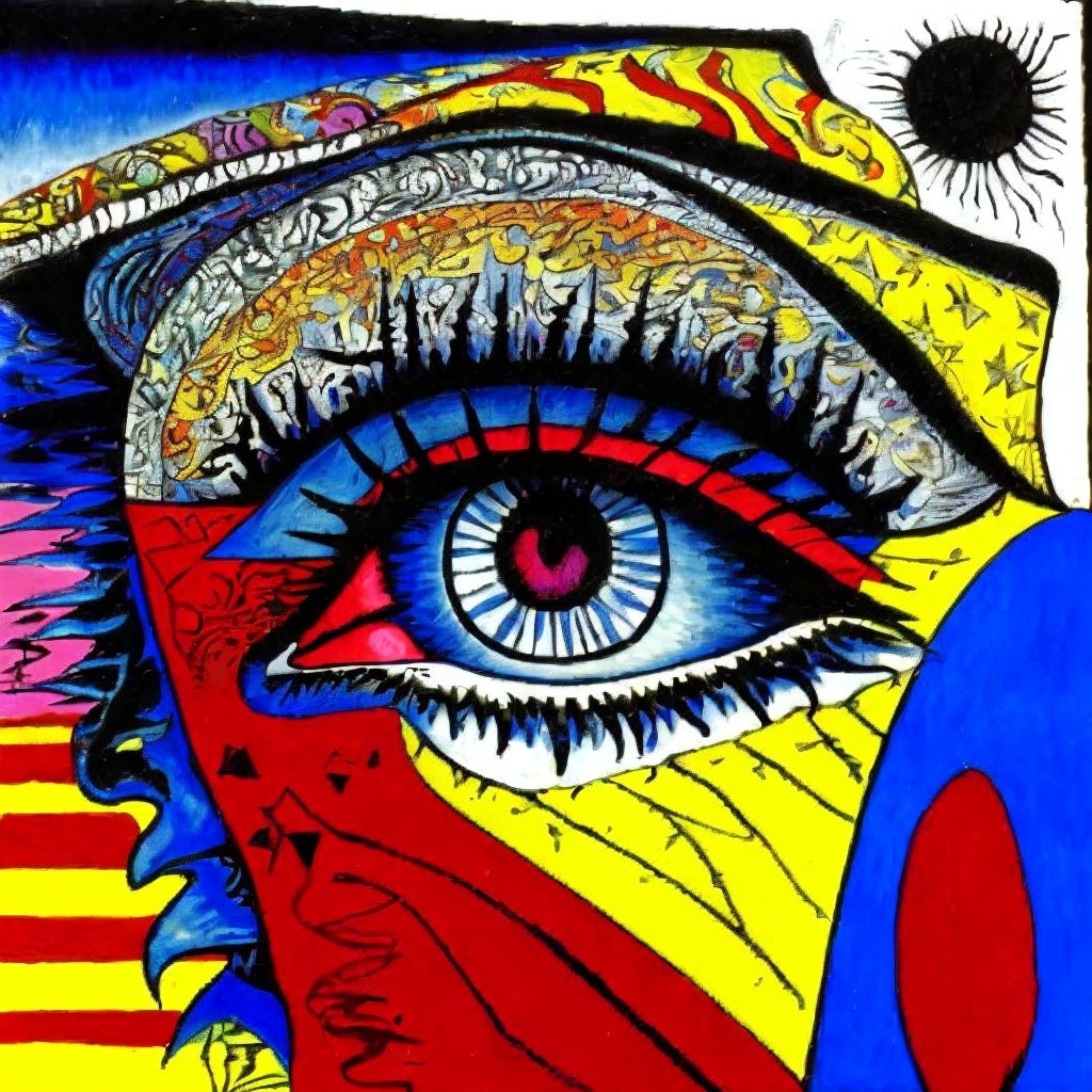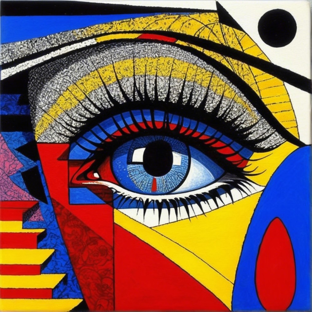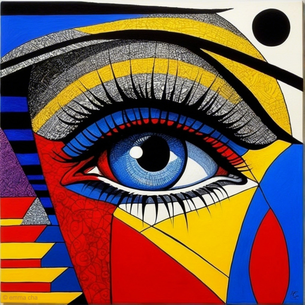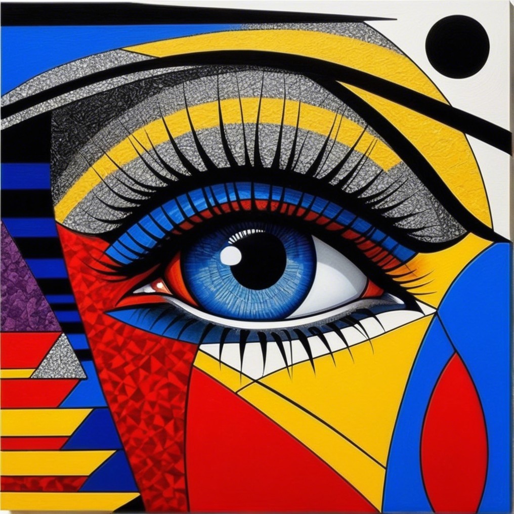 A striking fusion of realism and abstraction, this composition presents a piercing blue eye emerging from a fractured, geometric world. The interplay of bold primary colors, crisp black outlines, and intricate textures creates a dynamic sense of movement and depth. The detailed iris contrasts with the Cubist deconstruction surrounding it, forming a compelling vision of perception and expression.