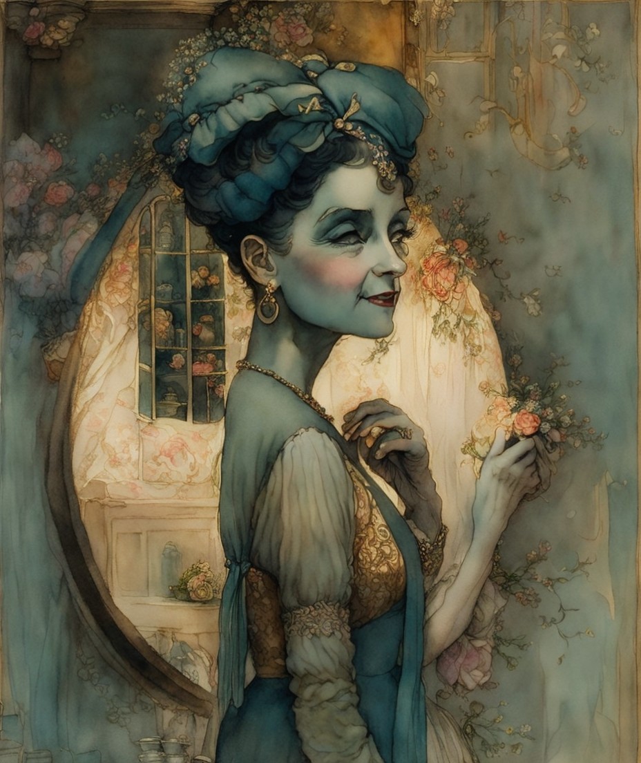 A charming elderly woman, adorned in a floral dress and a blue hat, smiles warmly while holding roses. She stands framed by a round mirror, surrounded by a cozy, flower-filled room.