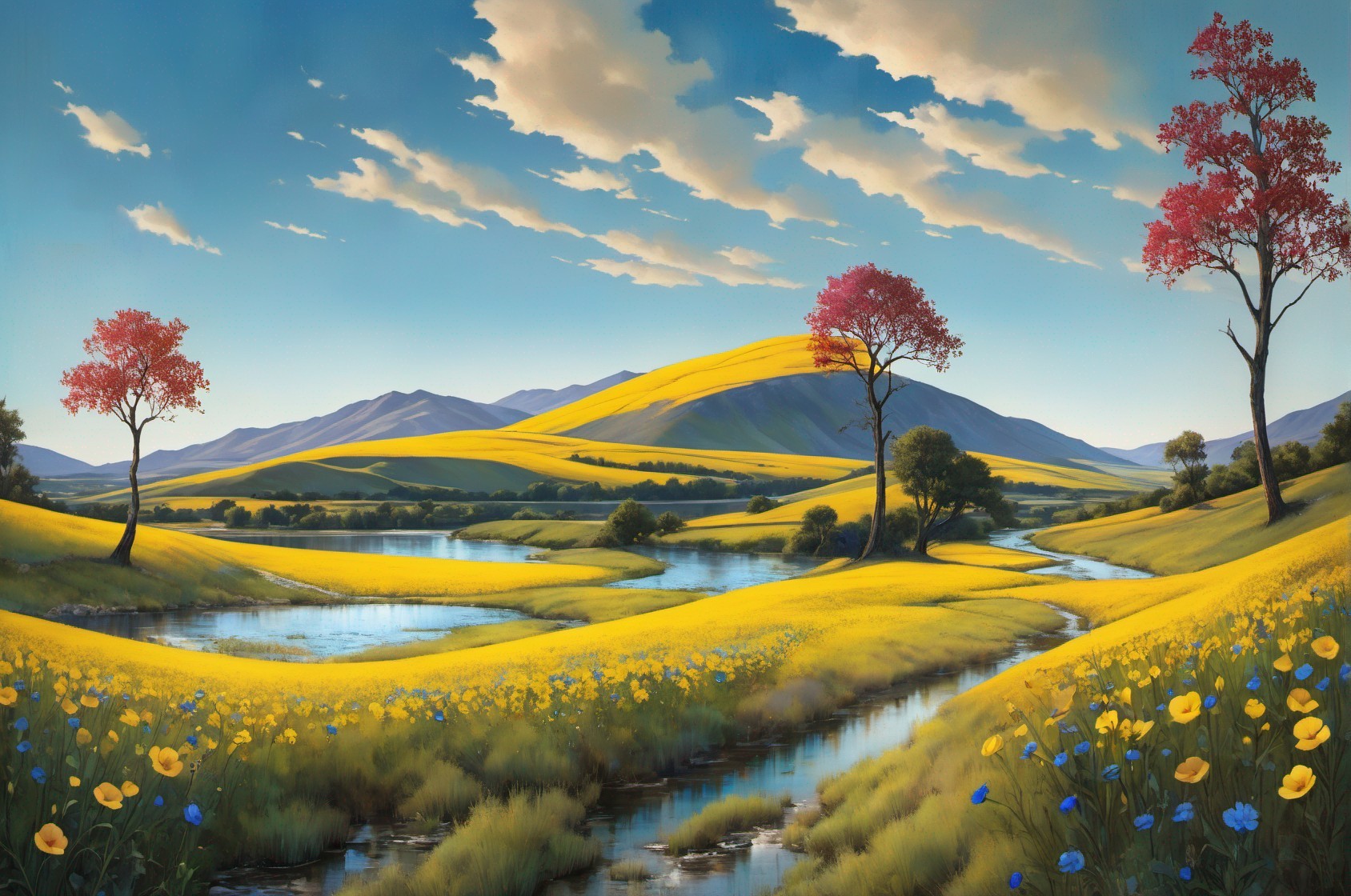 + Prompt:A field of yellow and blue flowers in the foreground. Beautiful a low-lying mount was visible in the far distance.Beautiful Meandering river.in stunning sunset, ink and oil, HD 4k.mixed media collage, textured, layered, assemblage, inspired by Brian Viveros and Esao Andrews, subtle bokeh effects, the entire composition exuding an aura of spring, with focus on texture, dynamic pose, unframed. vibrant colours. sharp focus dof Award winning photography 8k beautiful dynamic lighting colourful 4K 3D high definition crisp quality elegant extremely detailed very attractive fantastic view sharp focus smooth high definition beautiful lighting crisp quality vibrant colours