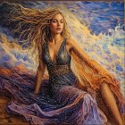 A mystical woman sits gracefully by the shoreline, her flowing gown intertwining with vibrant waves of blue and gold. The swirling colors evoke a sense of magic and tranquility in the scene.
