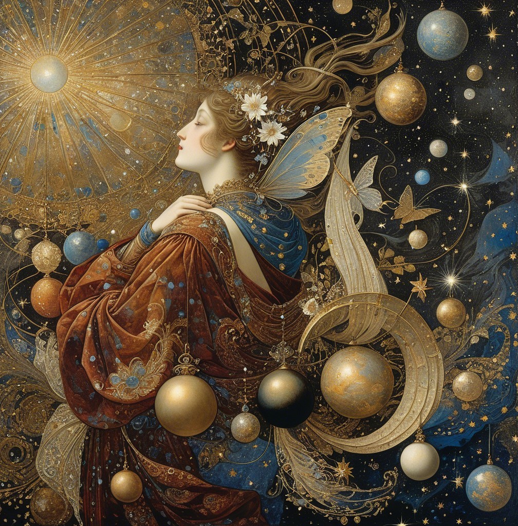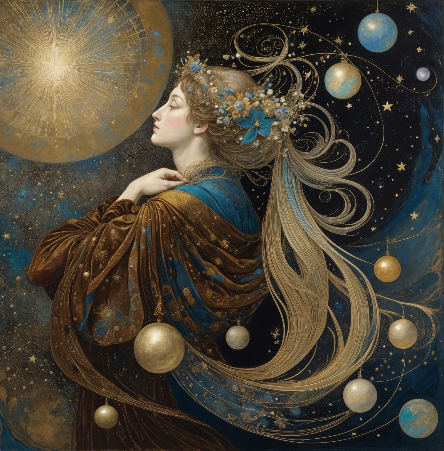 A celestial figure with flowing hair adorned with stars gazes serenely against a deep blue night sky, featuring a large moon and twinkling stars, exuding a mystical, ethereal atmosphere.
