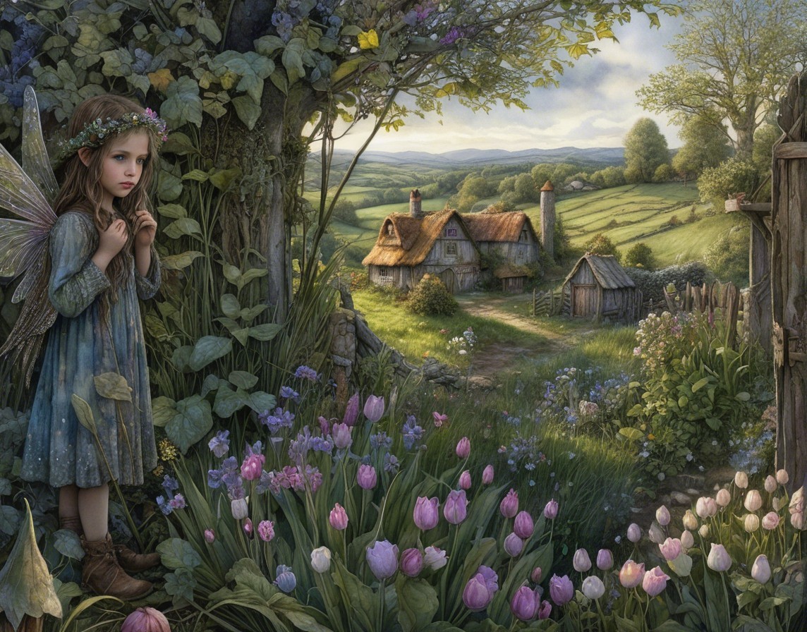 A whimsical scene depicts a young fairy sitting on a rock in a lush garden, surrounded by colorful flowers and quaint cottages, with rolling hills and a serene sky in the background.