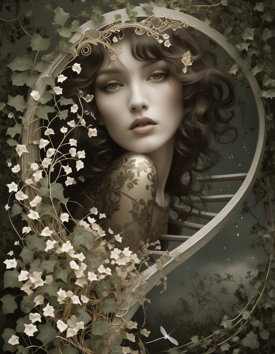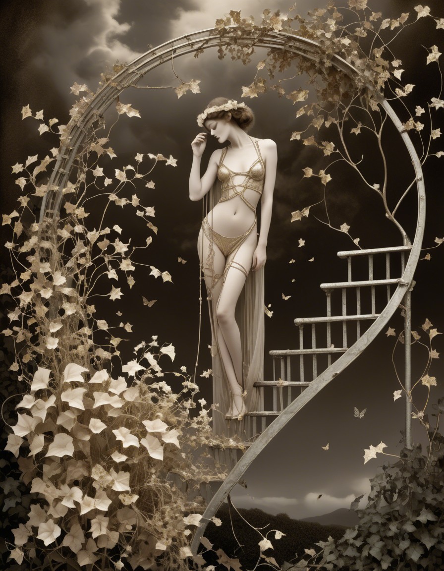An ethereal monochrome image of a woman ascending a spiral staircase, surrounded by butterflies and flowers, imparting a dreamlike fantasy ambiance.