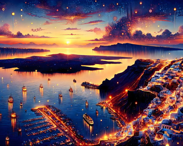 This vibrant abstract composition features a modern beach scene with sunbeds, showcasing dynamic lighting and rich details. The artwork blends hyperrealism with mystical influences, creating an elegant masterpiece.