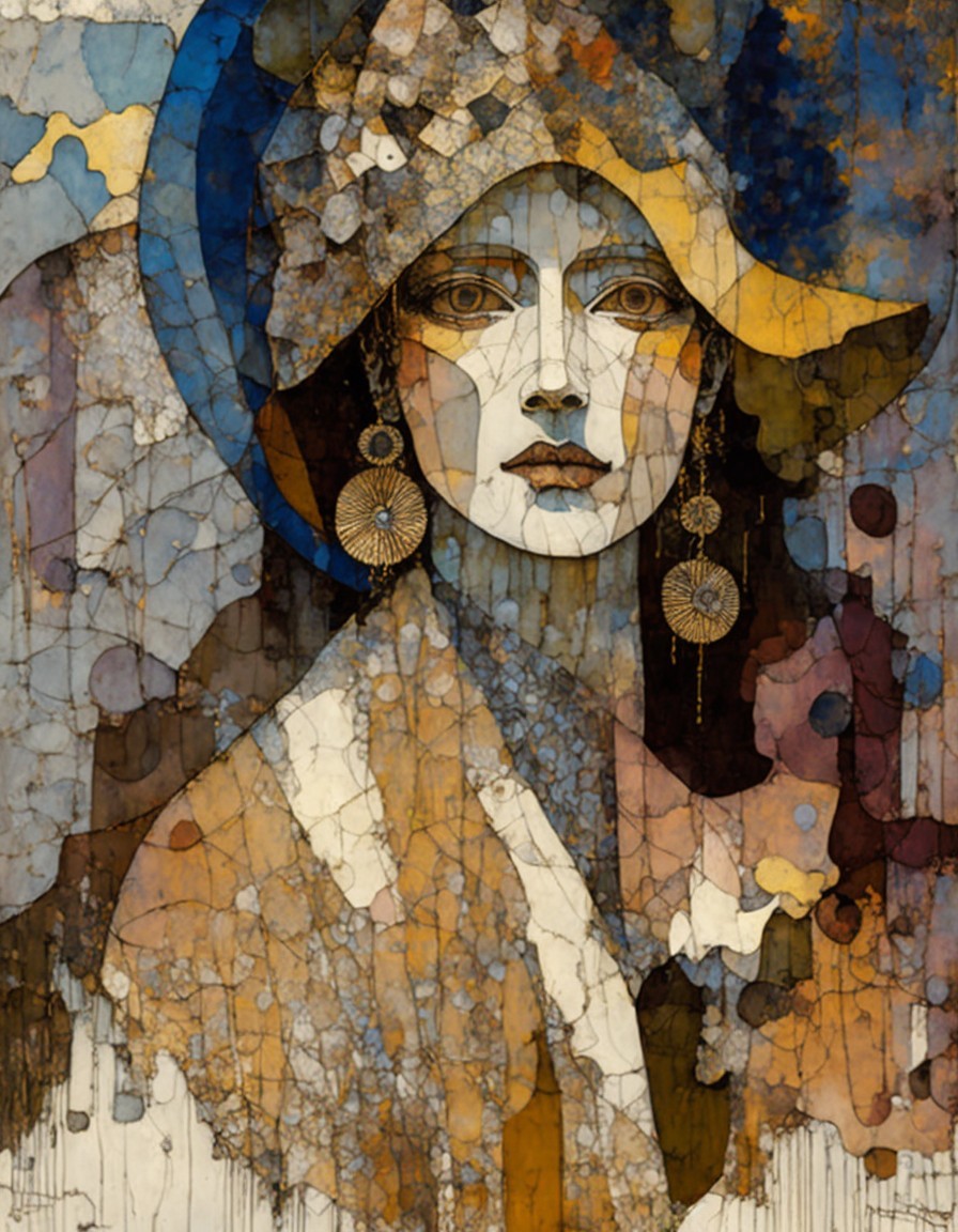 A stylized portrait of a solemn individual with large eyes, set against a mosaic-like background of muted earth tones.