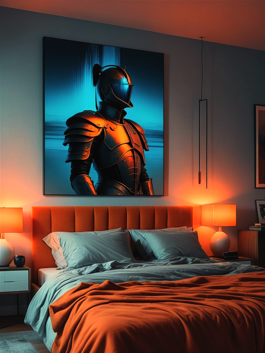 A modern bedroom features a large artwork of a futuristic armored figure against a blue backdrop. Soft orange lamps illuminate a cozy bed with gray bedding, creating a serene atmosphere.