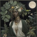 A serene figure adorned with jewelry and floral accents emerges from lush green foliage, accompanied by colorful birds, all under a luminous moon, evoking a sense of connection to nature.