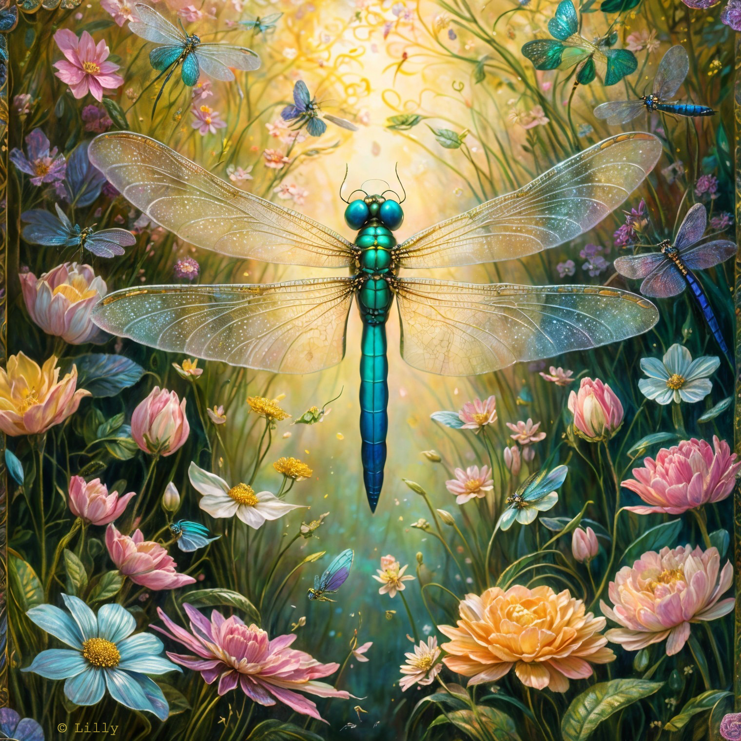 A vibrant scene filled with colorful flowers and delicate butterflies surrounds a stunning dragonfly, its iridescent wings shimmering in a warm, glowing light. Nature flourishes beautifully.