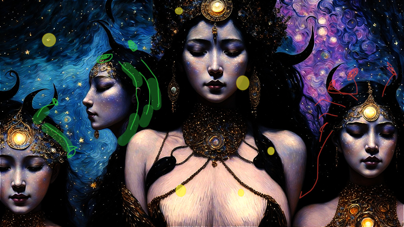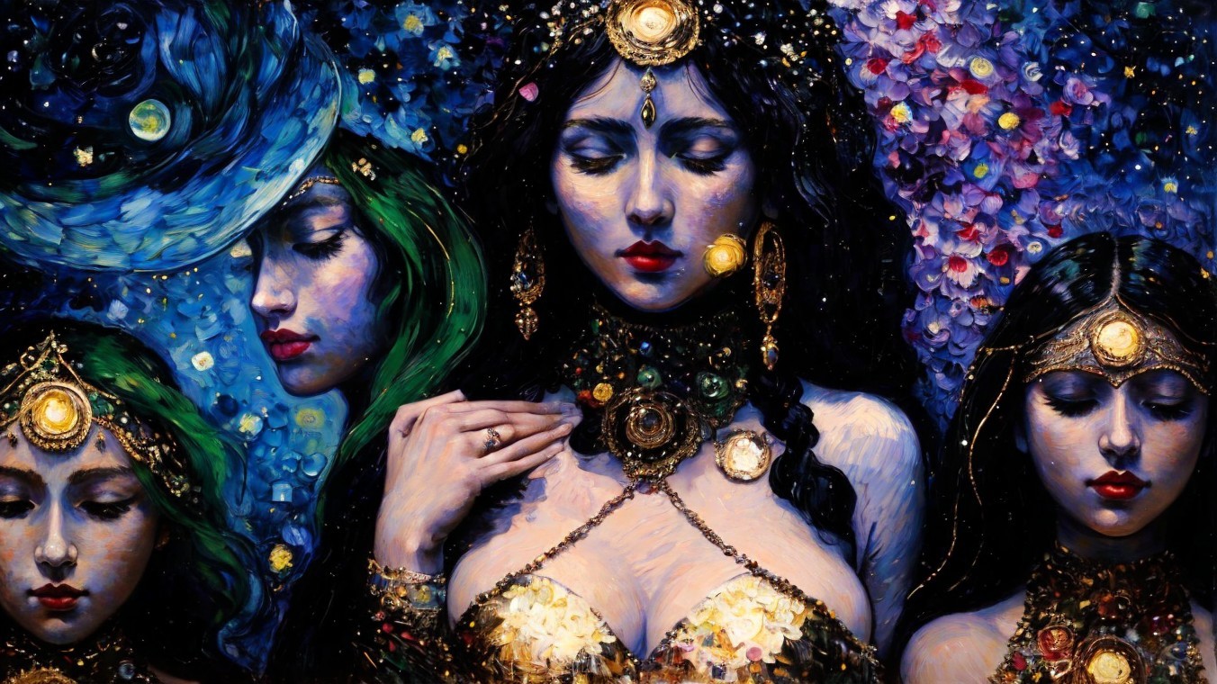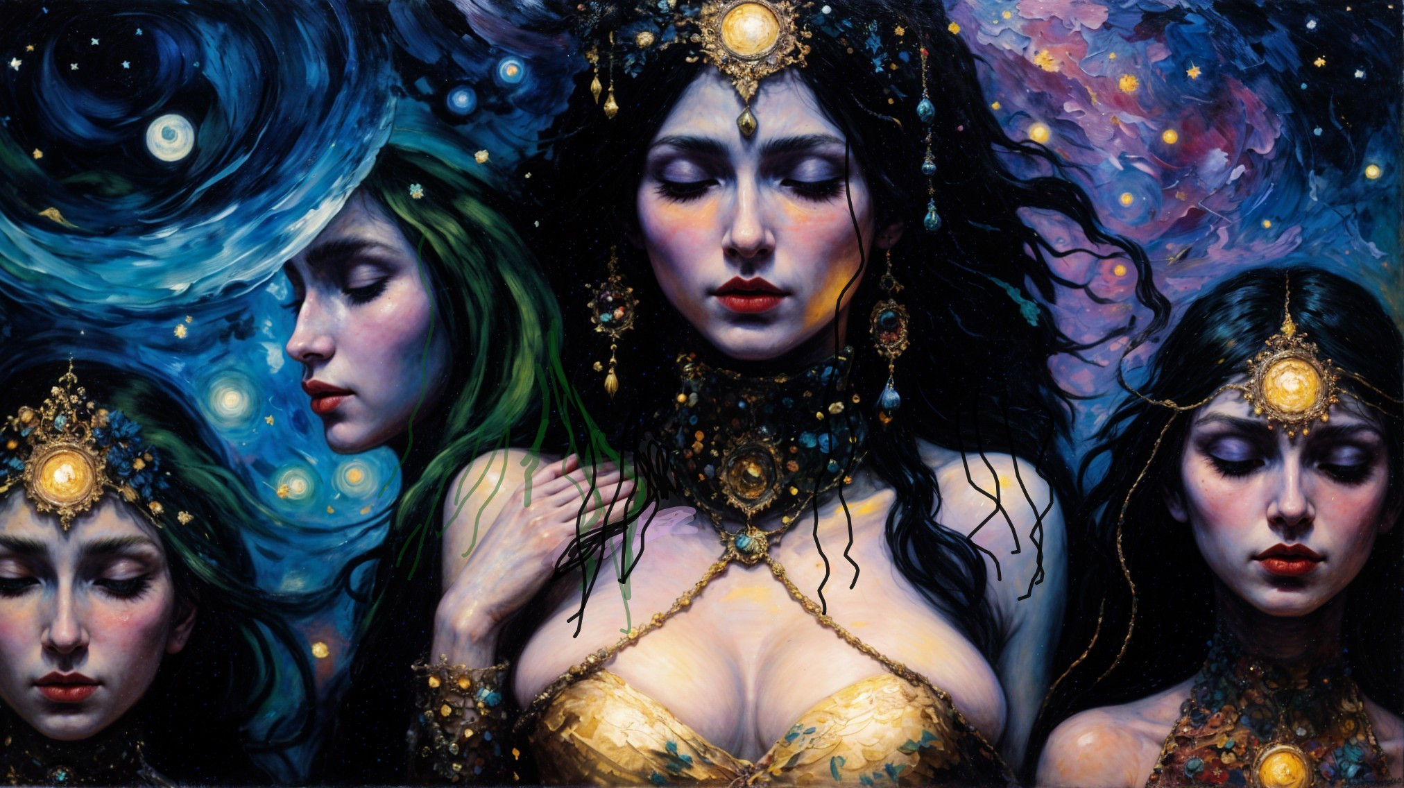 The image features four ethereal women with long, dark hair, adorned in ornate, golden jewelry, set against a cosmic background filled with stars and swirling galaxies, evoking a mystical atmosphere.