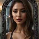 A woman poses gracefully in front of an ornate mirror, showcasing elegant features and soft, flowing hair. She exudes confidence in a delicate black lace top, with a softly lit background.