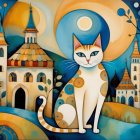 A beautifully illustrated cat with orange markings rests elegantly, surrounded by pumpkins and a whimsical landscape of castles and trees under a moonlit sky.