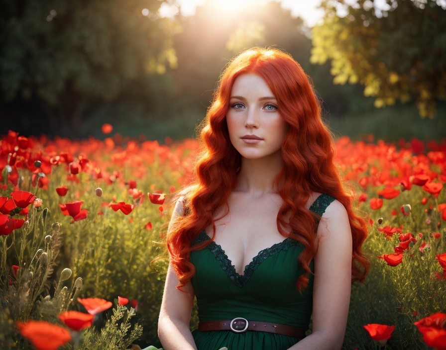 Red-haired woman in green dress among poppy field with sunlight and trees.
