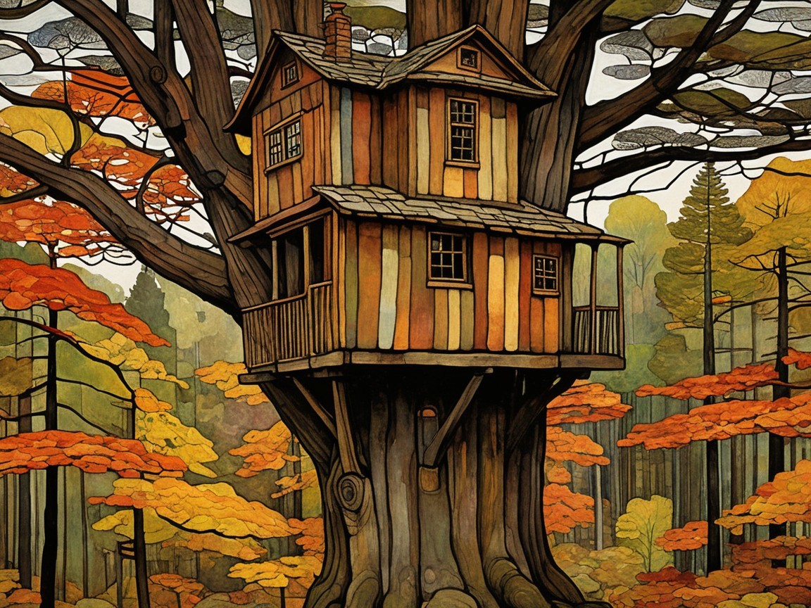 A whimsical treehouse nestled in a vibrant autumn forest, featuring orange and yellow leaves. The treehouse has a charming design with wooden planks and a small staircase.