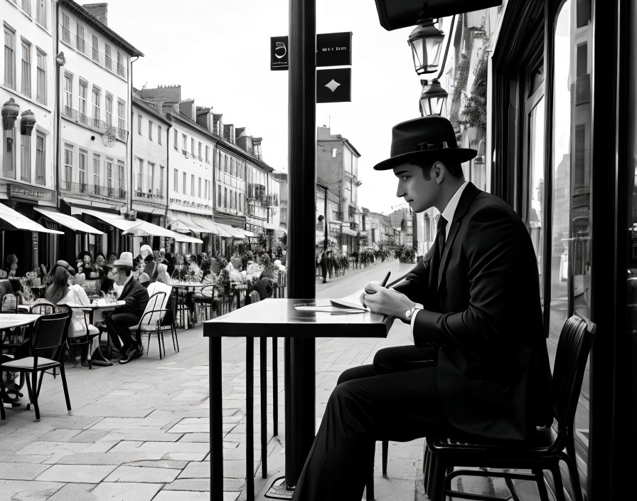 Prompt: black and white, colorless, desaturated, photography of a man wearing suit and hat, sitting in a café terrace, and creating a drawing of the street