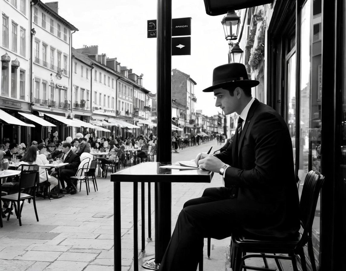 Prompt: "black and white, colorless, desaturated, photography of a man wearing suit and hat, sitting in a café terrace, and creating a drawing of the street"