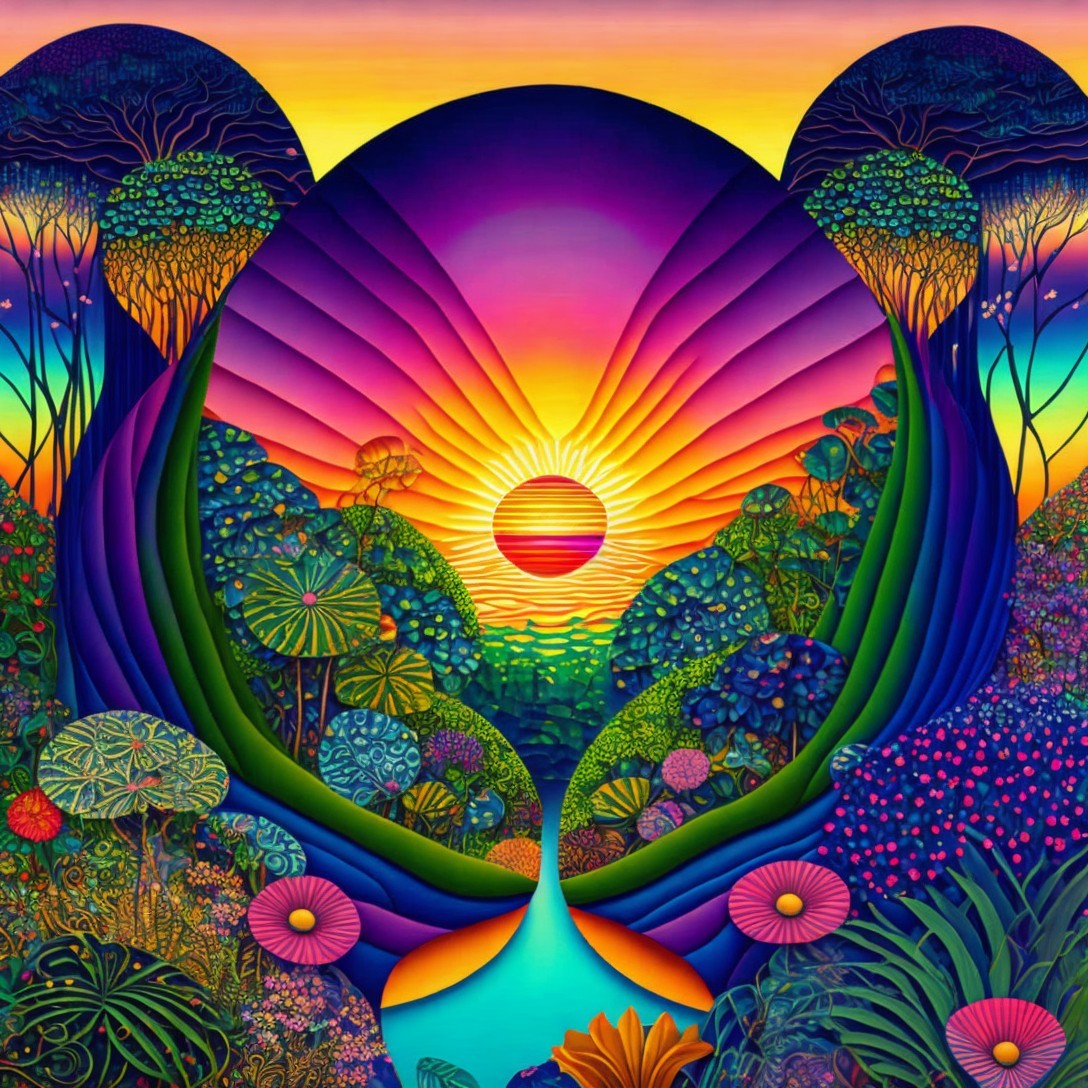 3d patchwork Sunrise high over realistic jungle with stream, trees, delicate plants and flowers, brightly colored in Tingatinga patterns, with elements in the style of Gustav Klimt