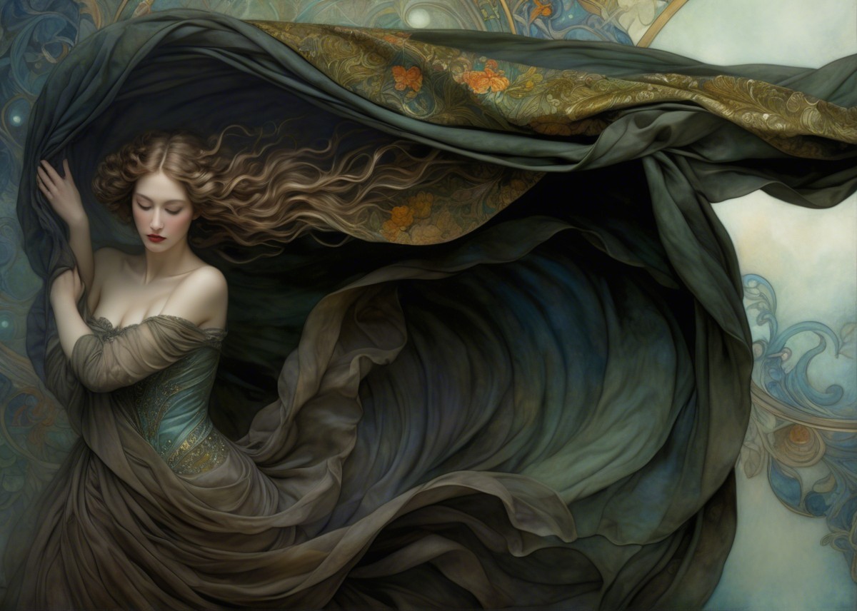 A beautifully styled woman with flowing red hair, dressed in an ornate gown, stands gracefully. Her flowing fabric and intricate patterns evoke a sense of elegance and artistry against a rich background.