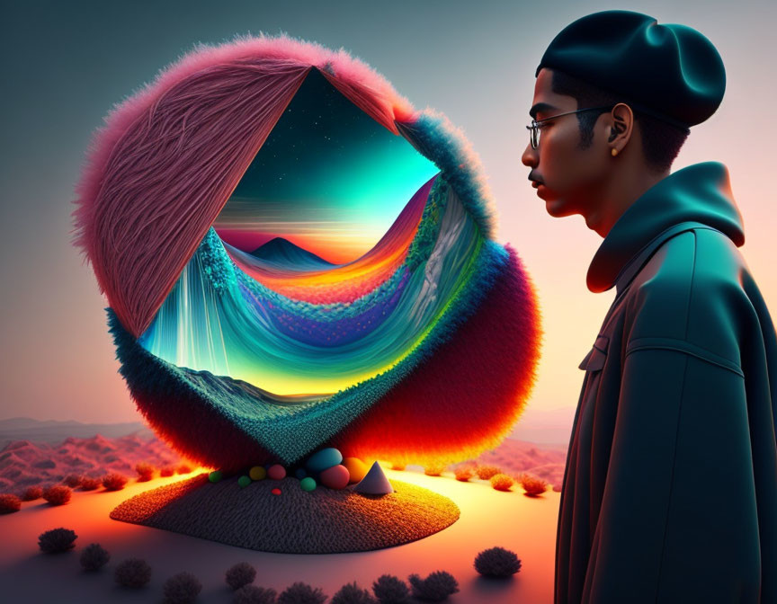 Blue uniformed person near heart-shaped portal revealing fantasy landscape.