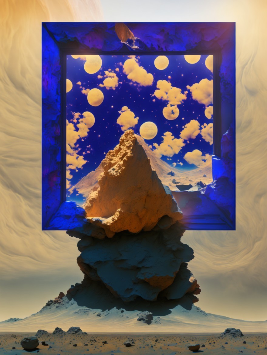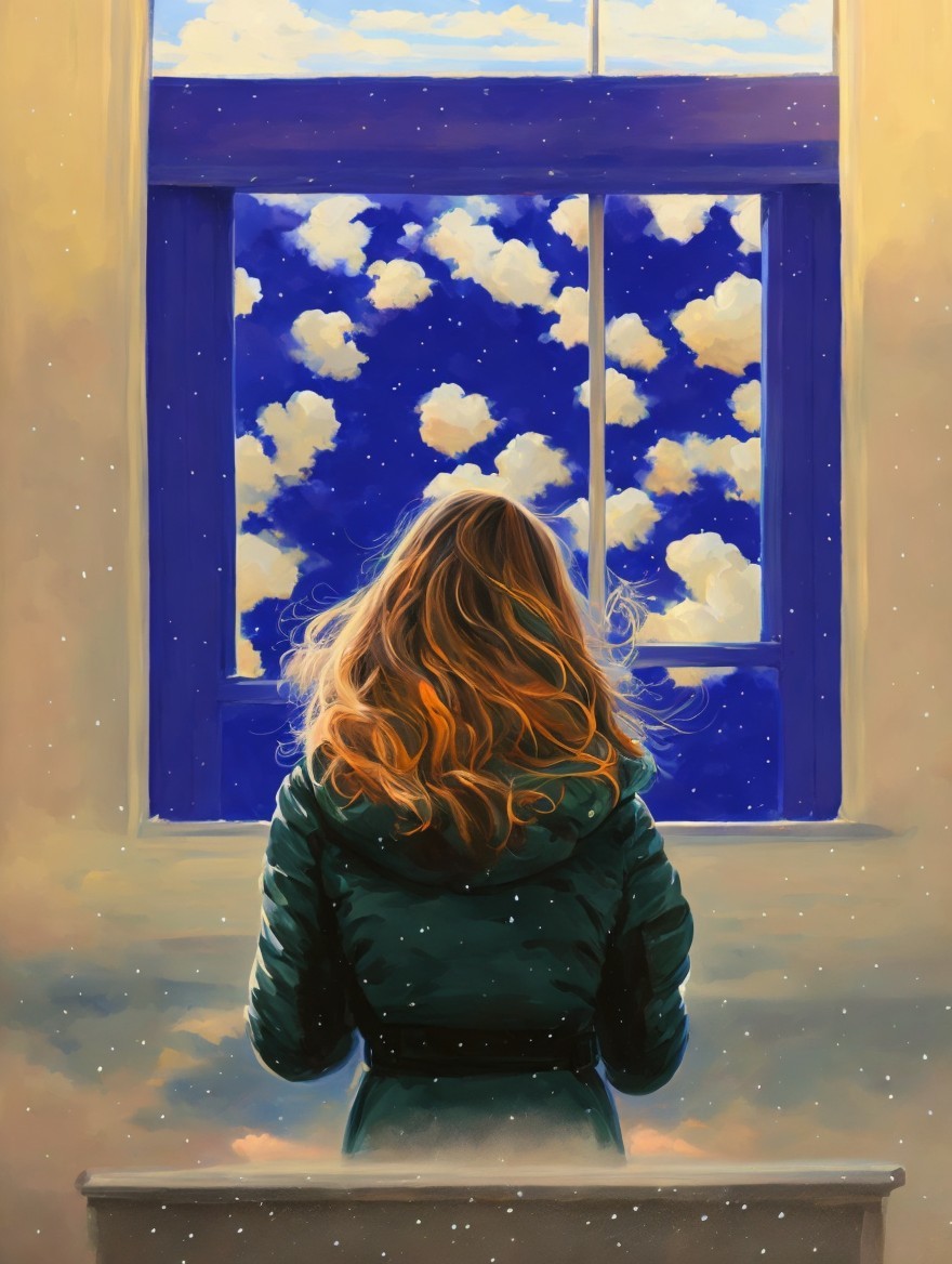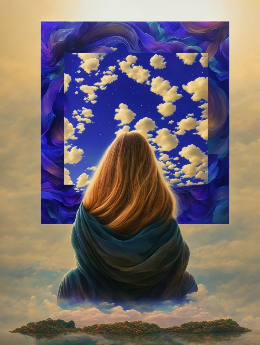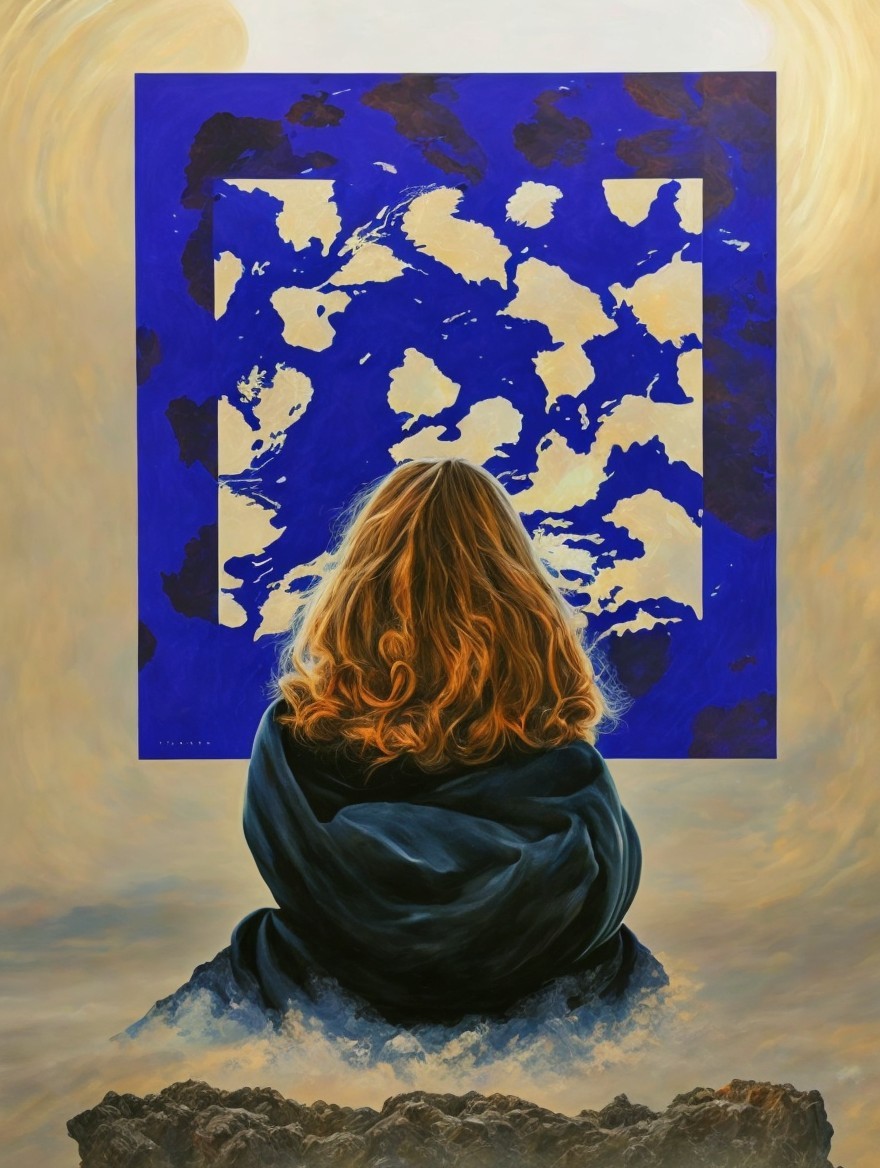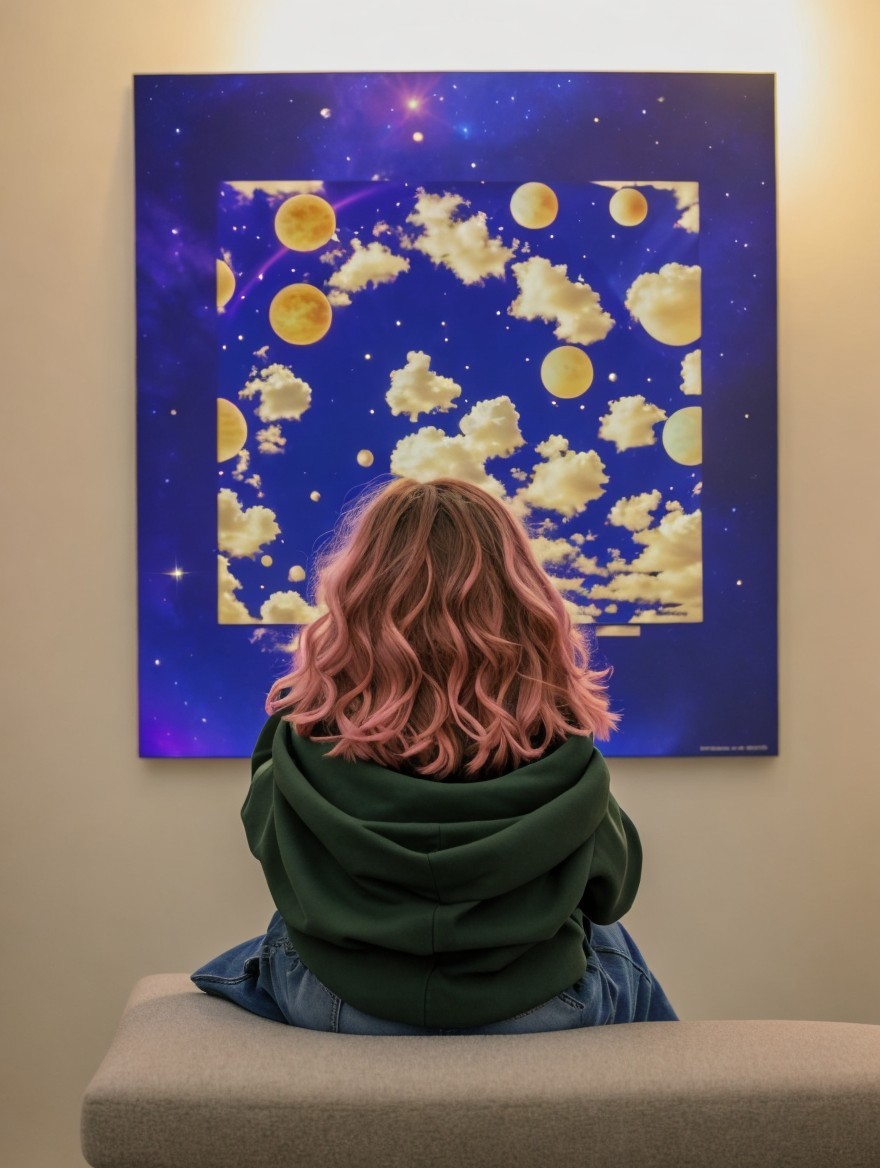 Person in Green Jacket Contemplates Surreal Celestial Painting