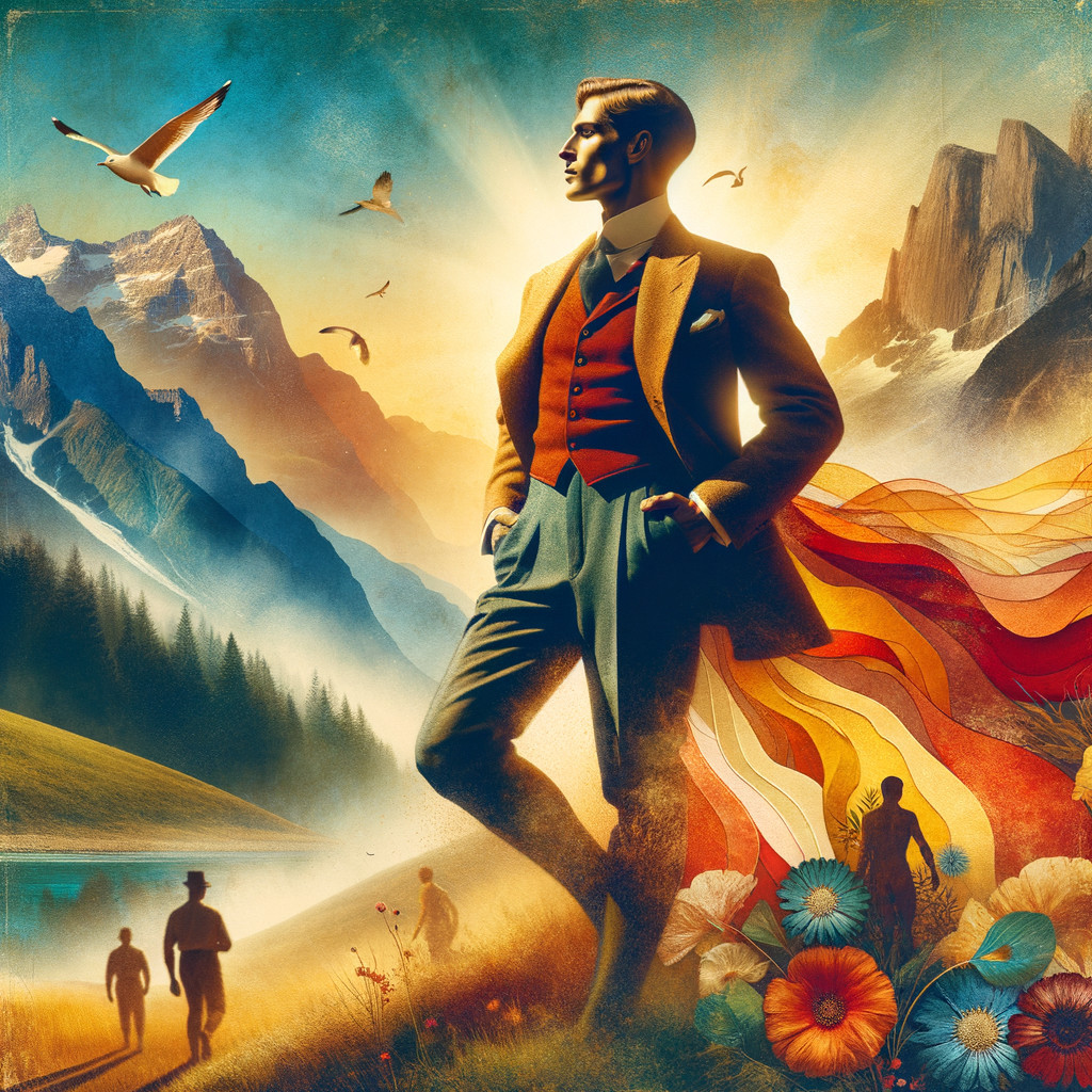 Prompt: Enhance! He stood straight on the hill looking towards mountains. Such a fine bearing thanks to the healthy life in the mountains! He has the young gentleman’s pigmentation, fair and golden.Surrounded by mysterious fog.