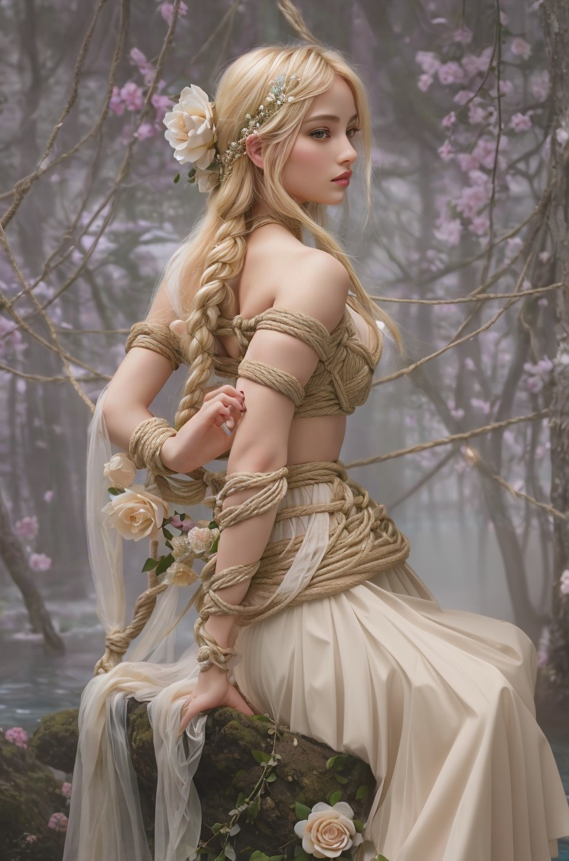 A fantasy-inspired image of a woman with braided hair and floral adornments sitting in a misty, flower-filled forest.