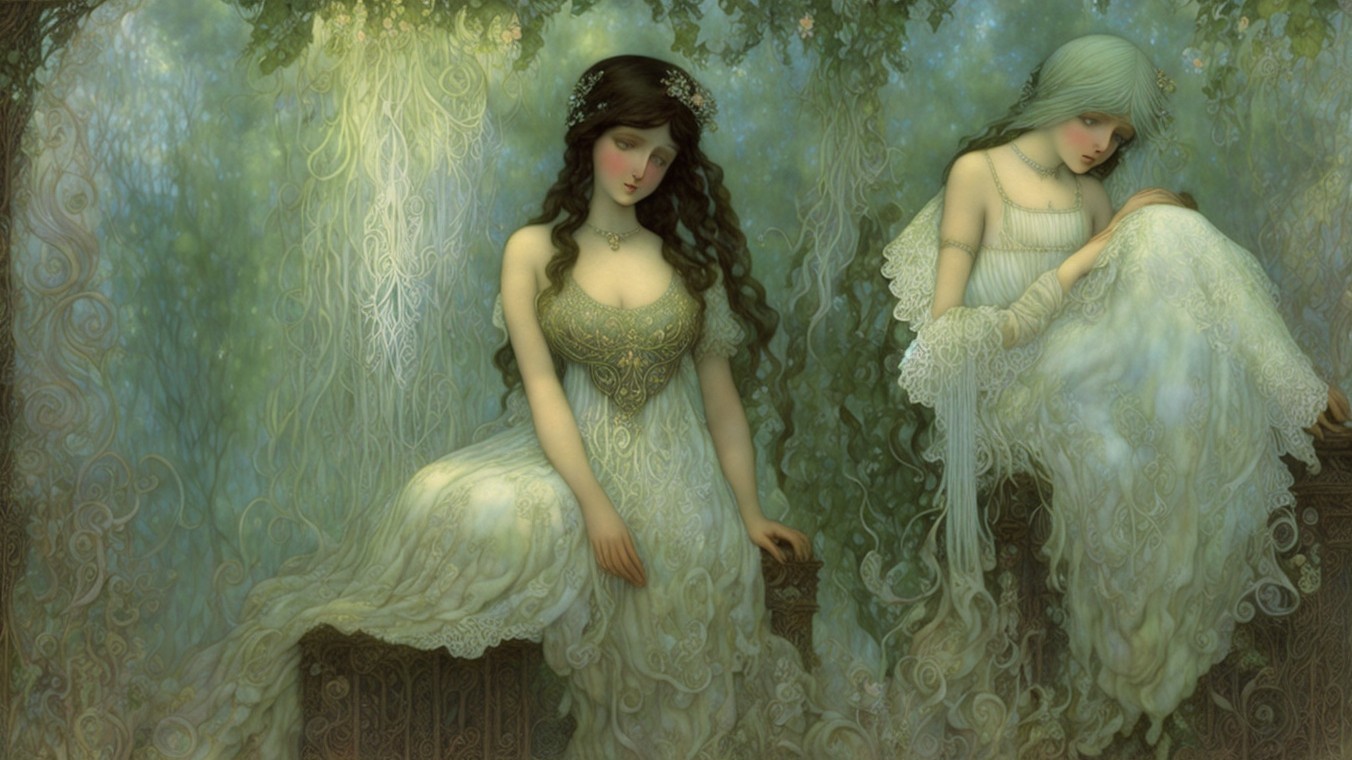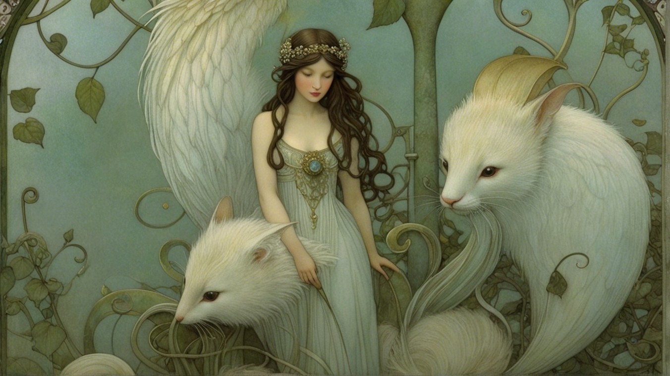 A serene figure with flowing hair and wings stands beside a mystical creature with goat-like features. She wears a beautiful gown, surrounded by soft clouds and lush foliage, conveying an ethereal vibe.