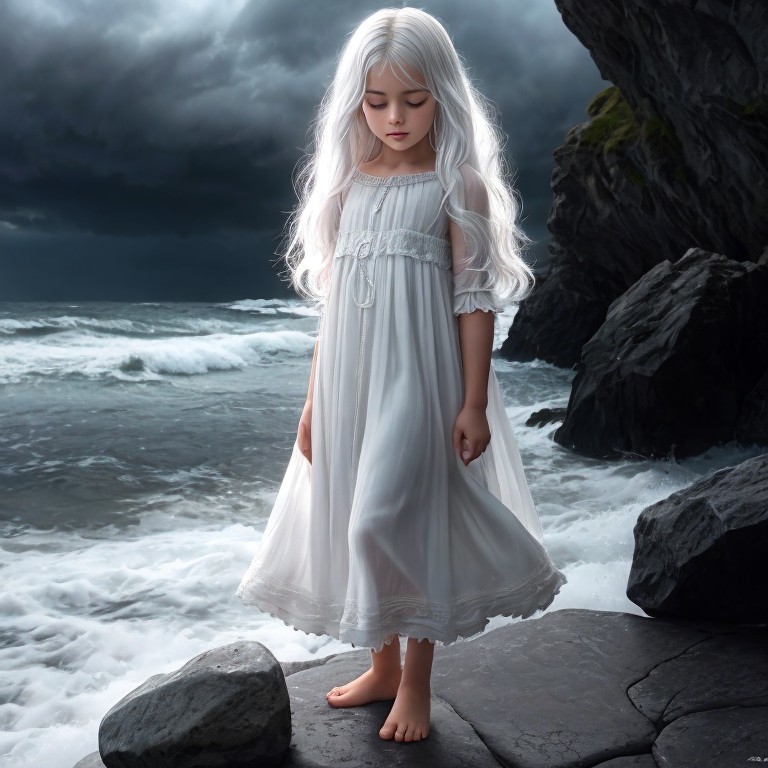 A young girl with white hair stands on rocky shore against stormy sea and dark clouds.