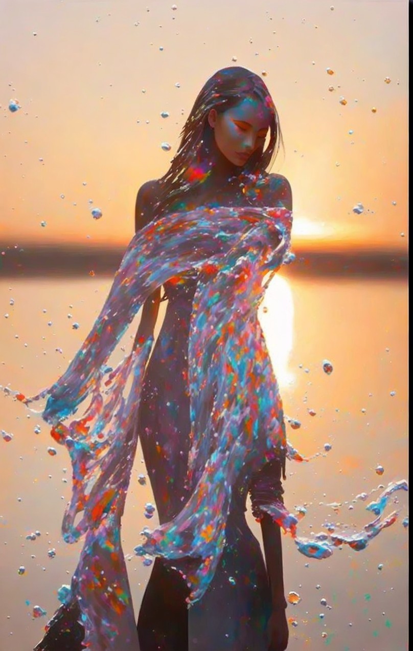 A woman in a vibrant, paint-splattered dress poses by the water at sunset.