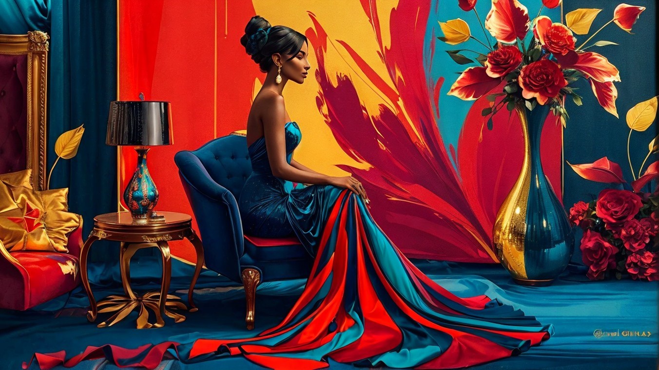 A woman in a striking blue gown sits elegantly on a chair, with a vibrant abstract mural behind her. Her flowing red skirt contrasts beautifully with the colorful backdrop.
