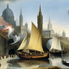 A vibrant medieval waterfront scene features tall sailing ships moored beside quaint buildings with pointed roofs. Majestic spires rise in the background, under a tranquil sky with two large moons.