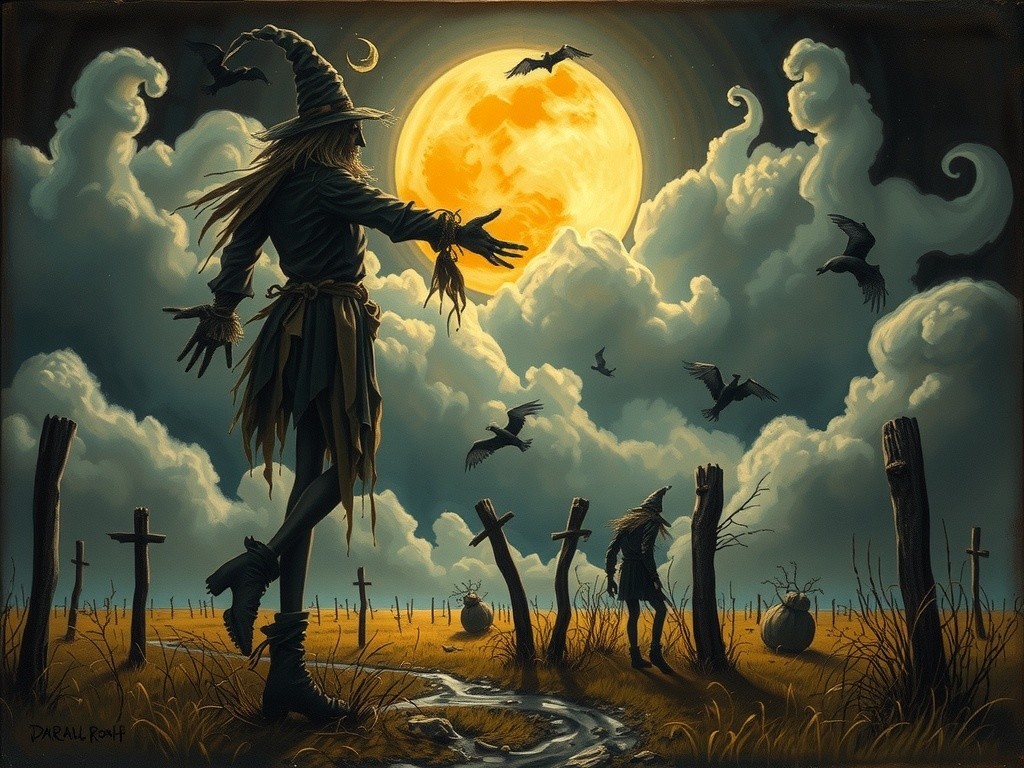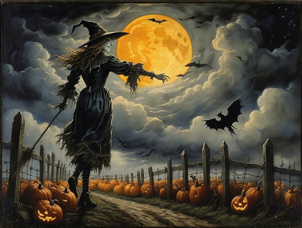 A witch in a dark blue dress wanders through a pumpkin patch, holding a staff under a glowing, full moon. Bats fly against a cloudy sky, adding to the eerie Halloween atmosphere.