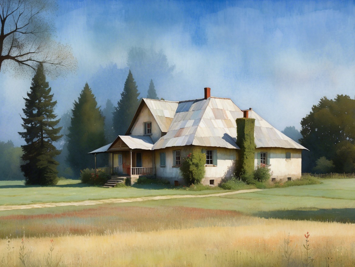 A charming countryside house with a snowy roof, surrounded by tall, lush trees and gentle hills. The scene is serene and painted in soft, dreamy colors, evoking a peaceful atmosphere.