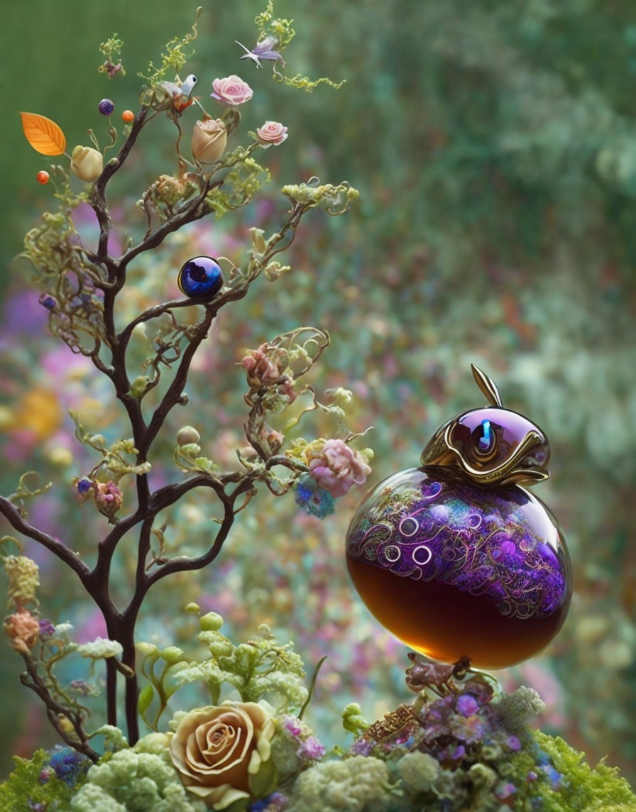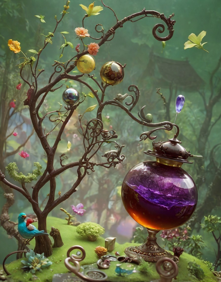 Whimsical Landscape with Surreal Tree and Orbs